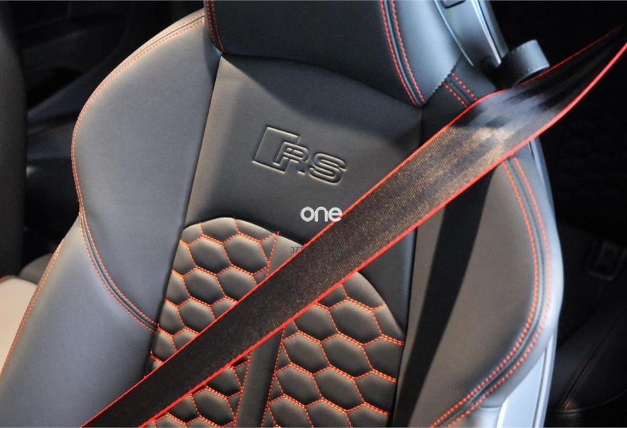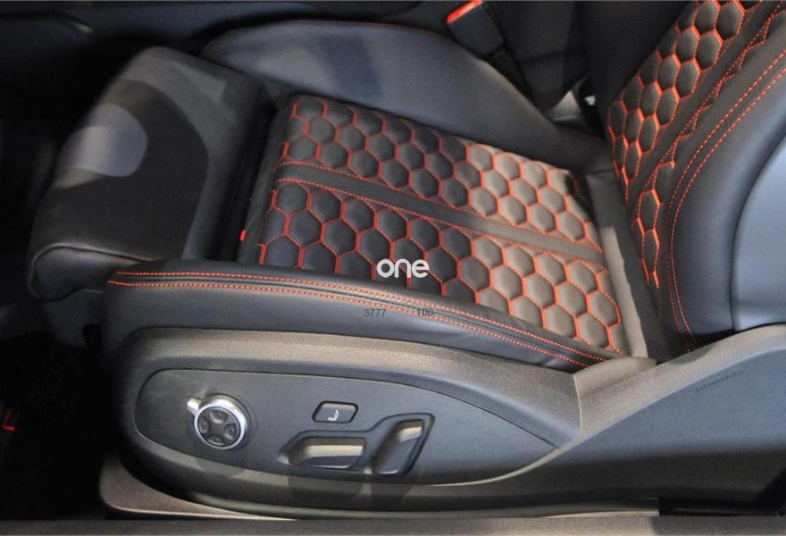 Tapicería en cuero napa fina con diseño panal y costuras en rojo
