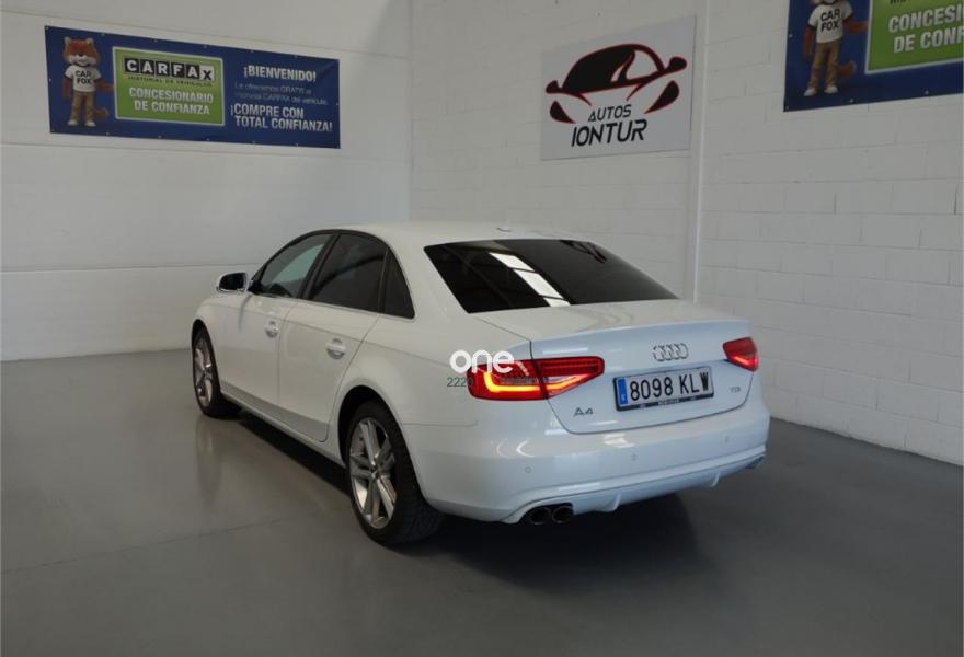 AUDI A4, Diesel, año 2013, 164385 kilómetros, color Blanco (S-line) , precio 16900€. Paquete business,Alfombrillas en color Audi exclusive,Asientos delanteros deportivos S,Inserciones en aluminio Trigon,Tapicería en tela Atrium,Revestimiento interior del techo en negro,Paquete deportivo S line,Audi music interface,Equipo de sonido Audi,MMI navegación,Radio digital DAB,Sensor de luz y lluvia,Sistema de control de presión de los neumáticos,Blanco Ibis,Llantas de aleación 8Jx18 diseño 5 radios dobles con neumáticos 245/40 R 18 (Audi exclusive),Tornillos de rueda antirrobo,Suspensión deportiva,Suspensión deportiva S line,Parking control plus. El coche (S-LINE) esta en perfecto estado.Tiene 12 MESES DE GARANTIA , libro de revisiones al dia,km garantizados por escrito y certificados.Climatizador bizonal,faros bi-xenon ,navegador,asientos deportivos,elevalunas eléctricos,espejos eléctricos ,control de velocidad,esp,radio cd ,ordenador de a bordo,apoyabrazo,start&stop,sensores de aparcamiento.Mejor Verlo.POSIBILIDAD DE FINANCIAR EL VEHICULO 100 % .ACEPTAMOS VEHICULO COMO PARTE DE PAGO. TODOS NUESTROS VEHICULOS SE ENTREGAN TOTALMENTE REVISADOS Y KILOMETROS CERTIFICADOS..