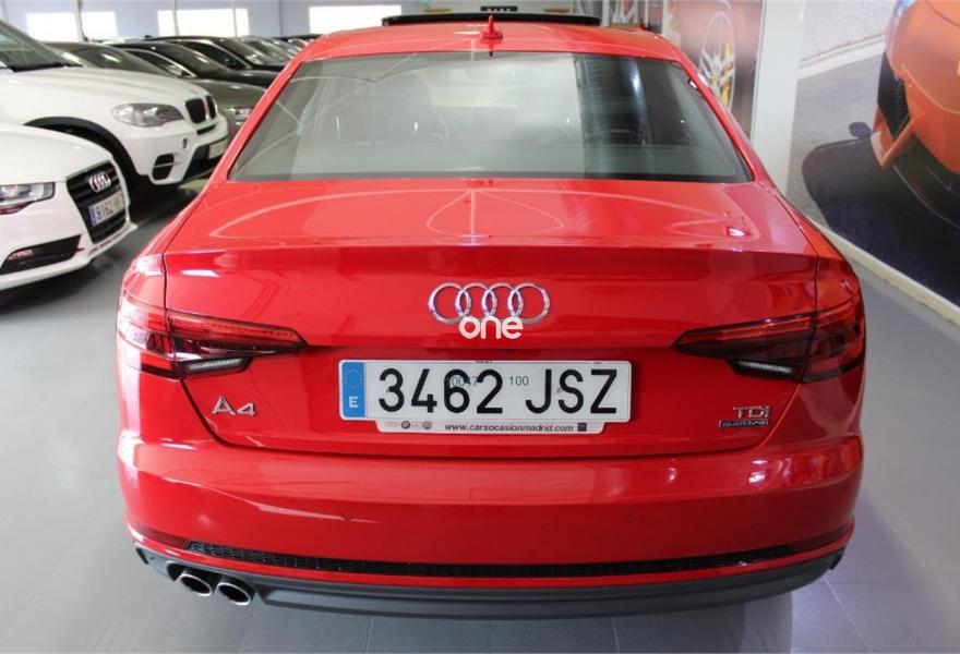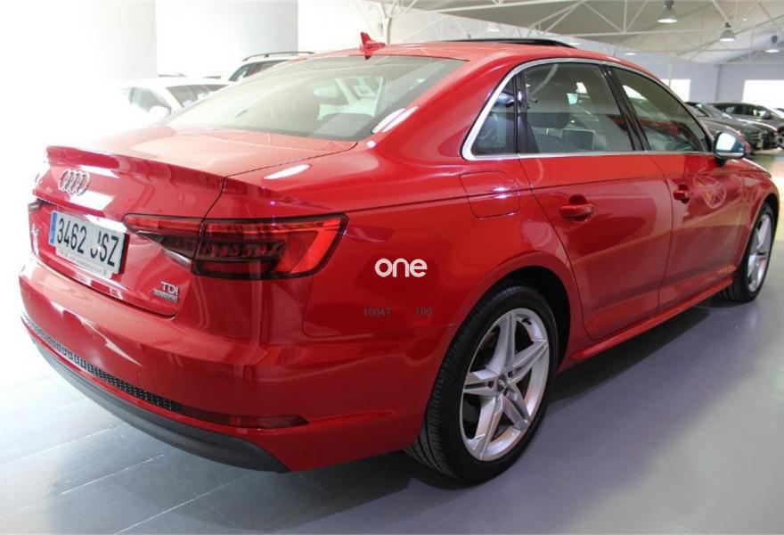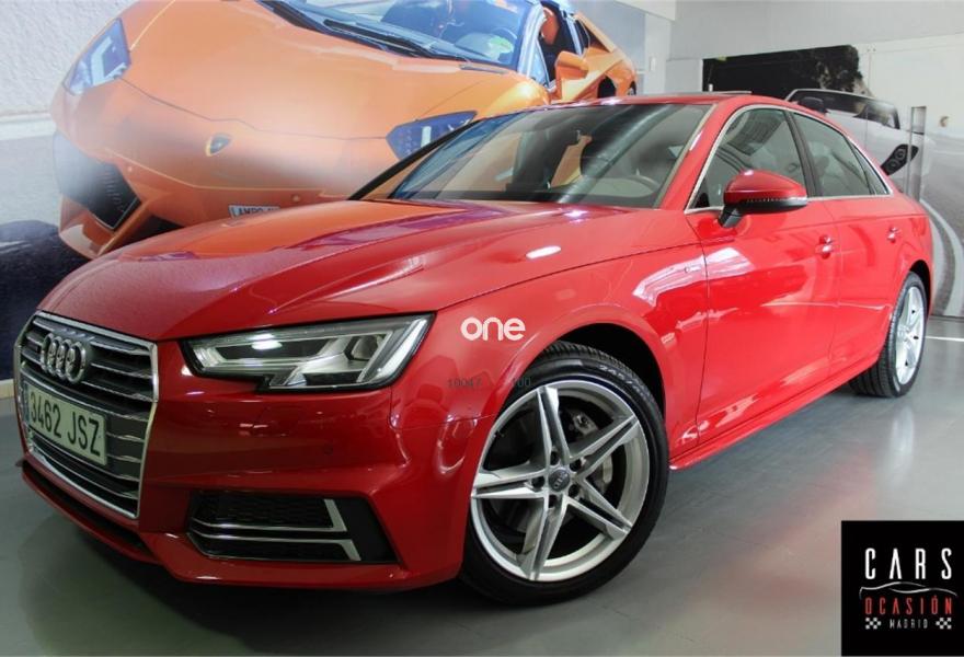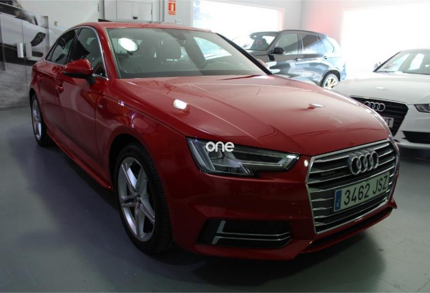 AUDI A4, Diesel, año 2016, 26000 kilómetros, color Rojo metalizado, precio 34990€. Sistema de aviso de límite de velocidad por reconocimiento de señales,Alfombrillas Audi exclusive,Inserciones en aluminio mate cepillado,Audi connect (3 meses prueba),MMI navegación plus,Climatizador de confort de tres zonas,Cuero Nappa Negro (S line),Elementos de mando en Alcantara/cuero de Audi exclusive,Faros LED,Lavafaros,Paquete deportivo S line,Paquete exterior S line,Techo corredizo eléctrico de cristal,Volante de tres radios multifuncional plus (incluye levas de cambio en automáticos),Espejos retrovisores exteriores calefactables plegables eléctricamente, con antideslumbramiento automático,Rojo Marte (metalizado),Suspensión deportiva,Audi parking system plus,Audi side assist incluyendo Audi pre sense basic y rear,Cámara de visión trasera. -IVA DEDUCIBLE INCLUIDO EN EL PRECIO