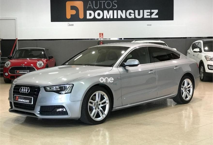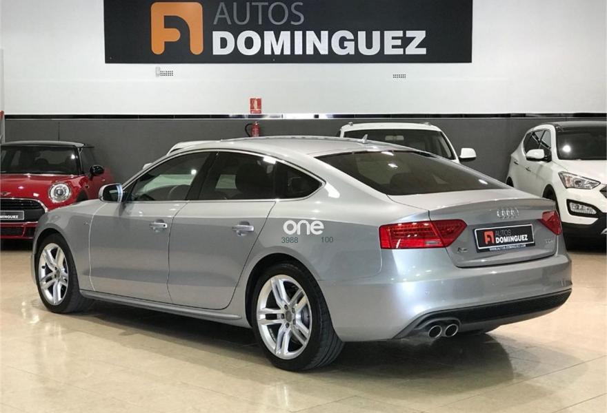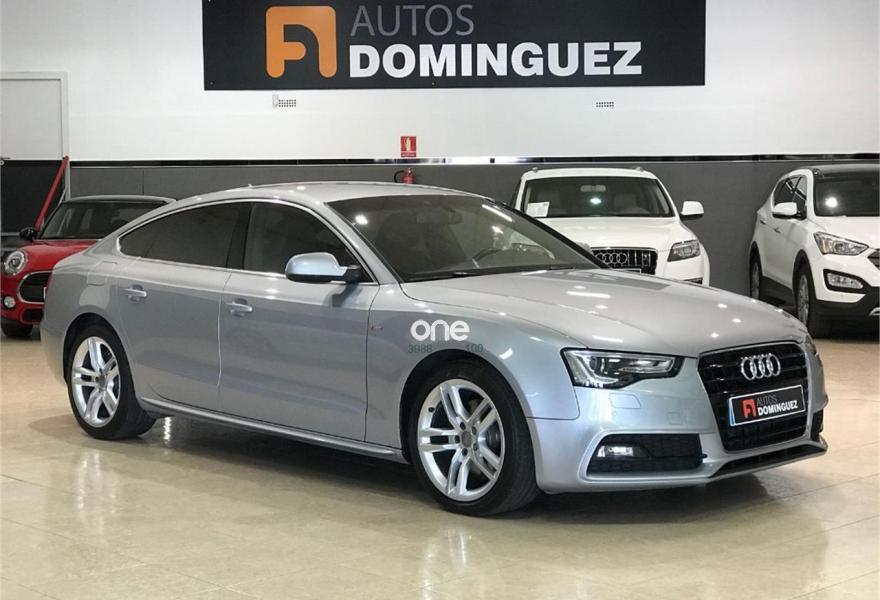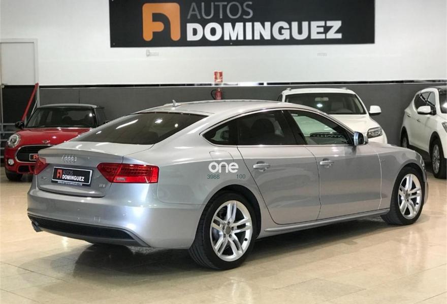 AUDI A5, Diesel, año 2015, 54900 kilómetros, color Gris / Plata metalizado, precio 25900€. Asientos delanteros deportivos diseño "S",Inserciones en aluminio cepillado gris,Tapicería S line en tela Sprint/cuero,Equipo de sonido Audi,MMI navegación plus,MMI navegación,Preinstalación de teléfono móvil con kit manos libres (Bluetooth) en apoyabrazos delantero,Volante multifunción S line,Cristales tintados oscuros,Espejos retrovisores exteriores calefactables y abatibles eléctricamente,Llantas de aleación 8Jx18 diseño de 5 radios dobles con neumáticos 245/40 R18 (Audi exclusive),Pintura metalizada,Suspensión deportiva S line,Volante deportivo de tres radios multifuncional con levas para el cambio multitronic/S tronic,Audi parking system advanced. AUDI A5 SPORTBACK 2.0 TDI 190 CV