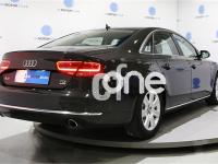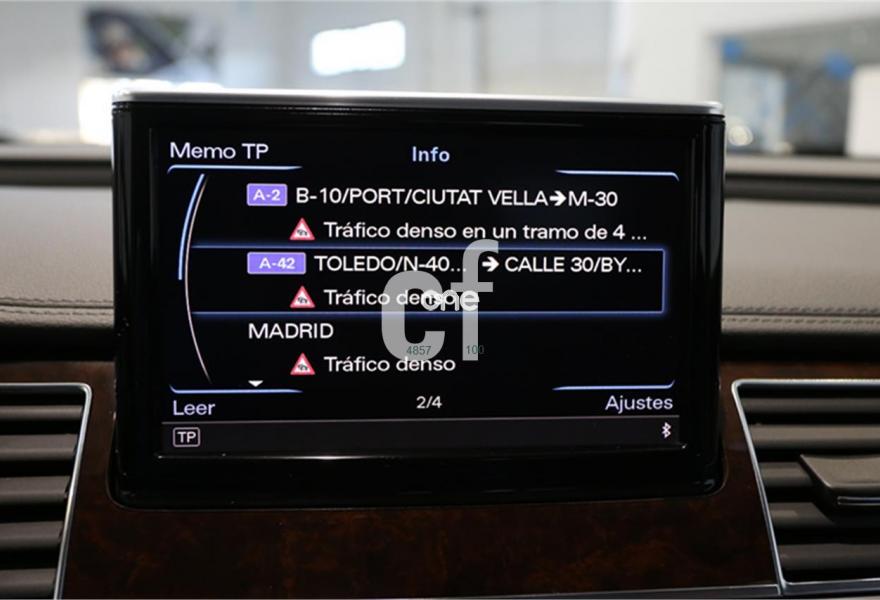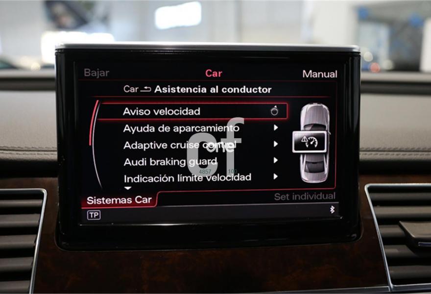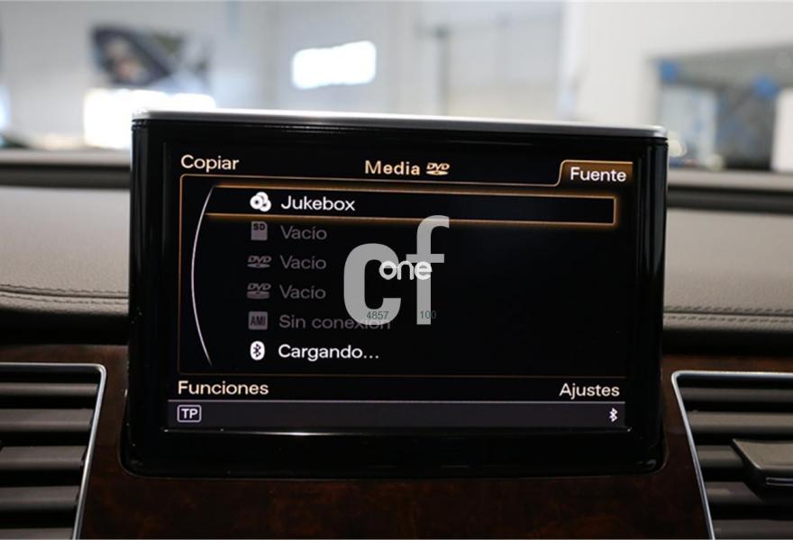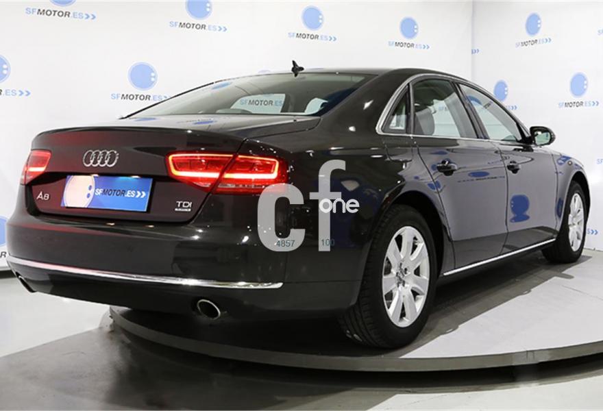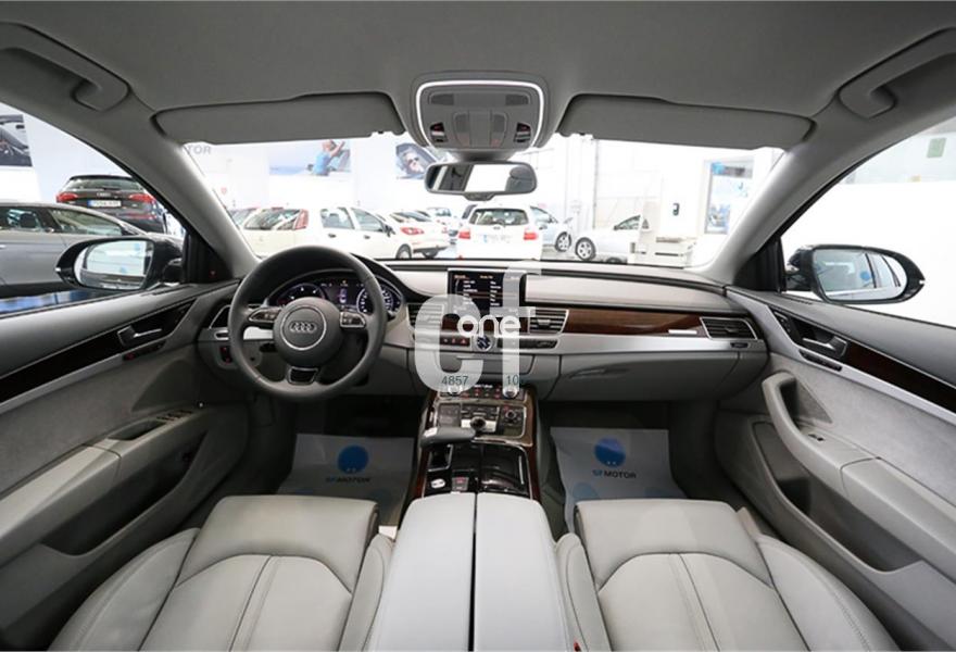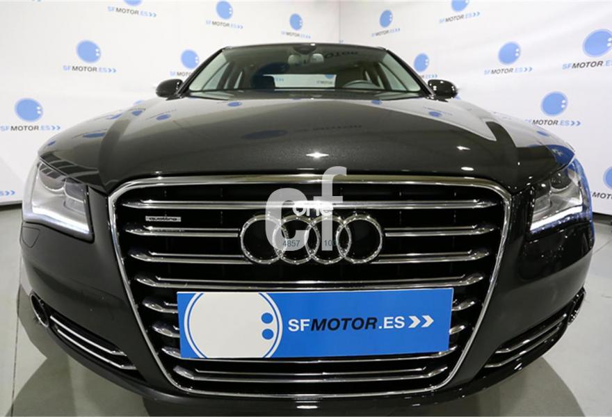 AUDI A8, Diesel, año 2012, 99000 kilómetros, color Gris / Plata (** GARANTÍA TOTAL e HISTORIAL DE MANTENIMIENTO **) metalizado, precio 38900€. Paquete comfort,Asientos de confort con función memoria,Alfombrillas en colores especiales (Audi exclusive),Inserciones decorativas en madera especial (Audi exclusive),Paquete interior no fumador,Reposabrazos de confort delante partido para conductor y acompañante,Tapicería en cuero natural,Instalación básica manos libres (Bluetooth) para teléfono móvil,Paquete maletero,Apertura y cierre eléctrico del maletero,Audi exclusive edition,Cierre servoasistido de las puertas,Cuero Natural Beige Terciopelo (Salpicadero Marrón/Beige) (Asientos confort),Dirección dinámica,Faros completos en tecnología LED,Espejos retrovisores exteriores antideslumbrantes automáticos, plegables eléctricamente y con función de memoria,Llave de confort,Interface para sistemas de localización de vehículos,Inserciones inferiores en aluminio cepillado plata,Iluminación de ambiente,MMI navegación plus,Luz adaptativa "adaptive light" con regulación continua del alcance de las luces,Paquete de cuero,Paquete de cuero ampliado,Preinstalación de teléfono móvil con kit manos libres (Bluetooth),Volante deportivo de cuero multifuncional de 3 radios con levas de cambio,Gris Cuarzo (metalizado),Pintura metalizada,Sin inscripción trasera de motor,Audi lane assist (asistente de mantenimiento de carril),Control de crucero adaptativo. PRECIO 38.900€ (Oferta sujeta a financiación mínima de 20.000€ o a la entrega de su viejo coche). Precio sin financiar 39.900€.