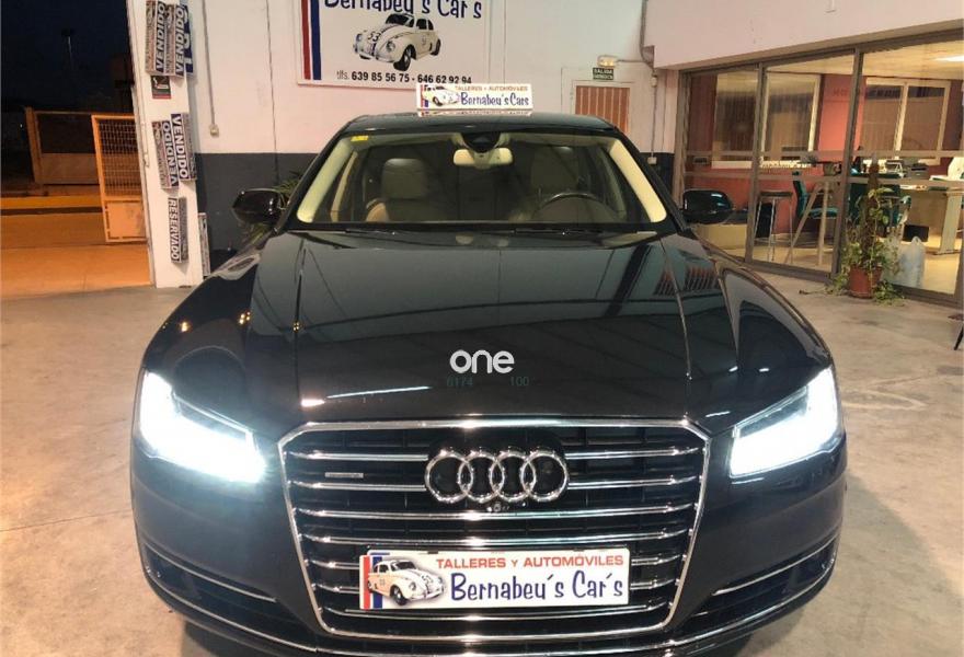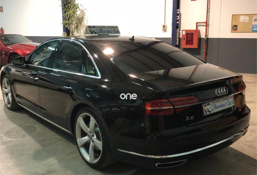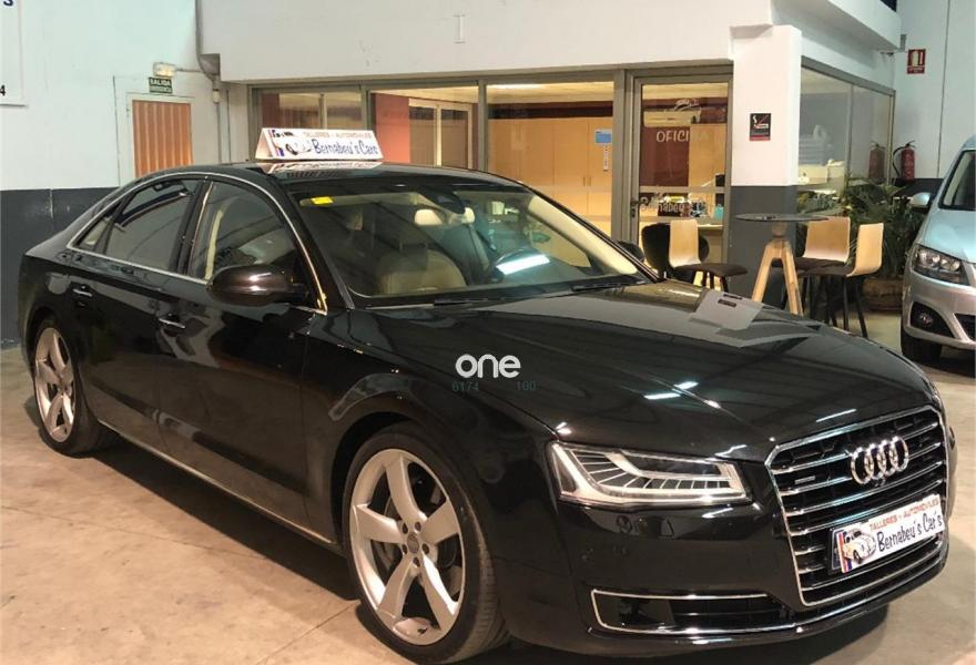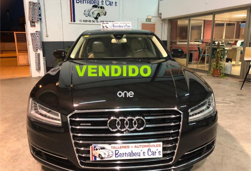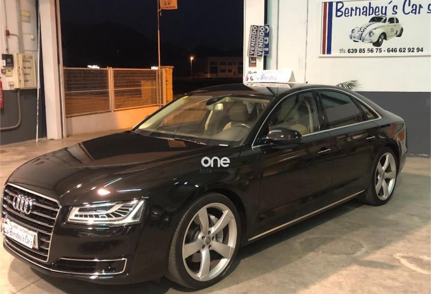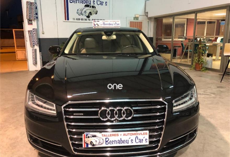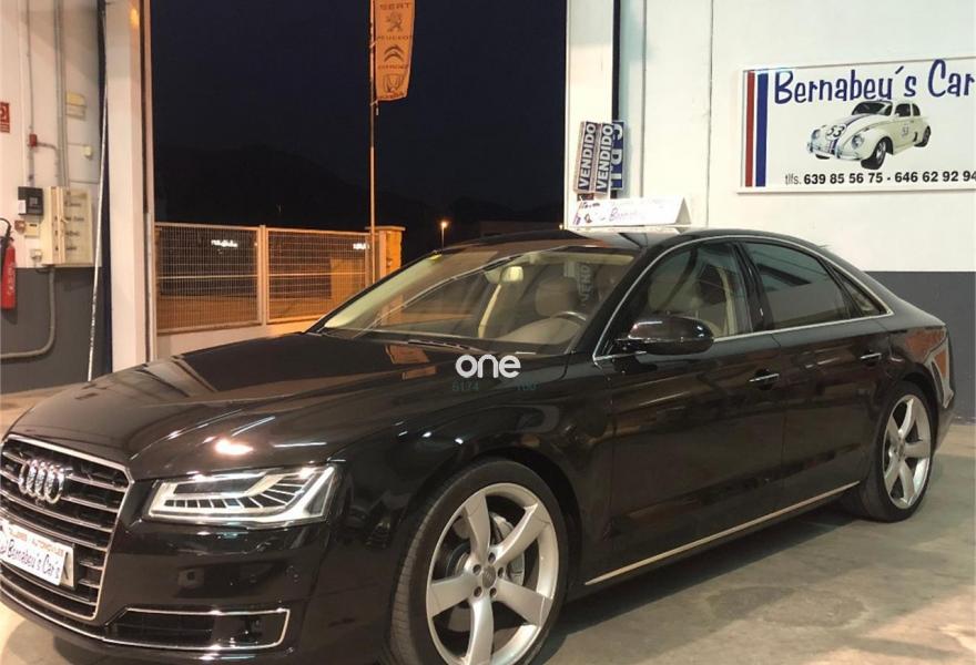 AUDI A8, Diesel, año 2014, 199000 kilómetros, color Negro metalizado, precio 29790€. 4 cámaras de entorno,Audi Park assist,Diferencial trasero deportivo,Paquete comfort,Sistema de aviso de límite de velocidad por reconocimiento de señales,Alfombrillas en colores especiales (Audi exclusive),Asientos con función memoria,Asientos de confort con función memoria,Asientos delanteros y traseros climatizados con función masaje,Tapicería en cuero natural,Cargador de 6 DVD/CD en la guantera,Instalación básica manos libres (Bluetooth) para teléfono móvil,Mando a distancia (HomeLink),Paquete maletero,Rear Seat Entertainment,Sistema de sonido Bang&Olufsen Advanced,Apertura y cierre eléctrico del maletero,Cinturones de seguridad en colores especiales (Audi exclusive),Climatizador automátco de cuatro zonas,Cortinilla eléctrica en luneta posterior,Cortinilla eléctrica en luneta y ventanas laterales posteriores,Cuero Valcona Beige Atlas (Asientos confort),Espejos retrovisores exteriores antideslumbrantes automáticos, plegables eléctricamente y con función de memoria,Faros matrix LED,Iluminación adicional trasera,Iluminación de ambiente,Inserciones inferiores en aluminio cepillado plata,MMI navegación plus,Molduras de entrada delanteras personalizables,Nevera para bebidas (Audi exclusive),Paquete de cuero ampliado,Paquete de llave de confort con apertura por control gestual y maletero eléctrico,Volante de cuero 4 radios calefactablemultifuncional con levas de cambio,Cristales tintados oscuros con laminado doble,Llantas de aleación 9Jx21 diseño de 5 brazos "Estructura" con neumáticos 275/35 R21 (Audi exclusive),Pintura metalizada,Suspensión neumática adaptativa Sport,Cámara de visión trasera,Control de crucero adaptativo,Set de reparación de neumáticos. "ESPECTACULAR UNIDAD AUDI A8 3.0 TDI 258 CV !!