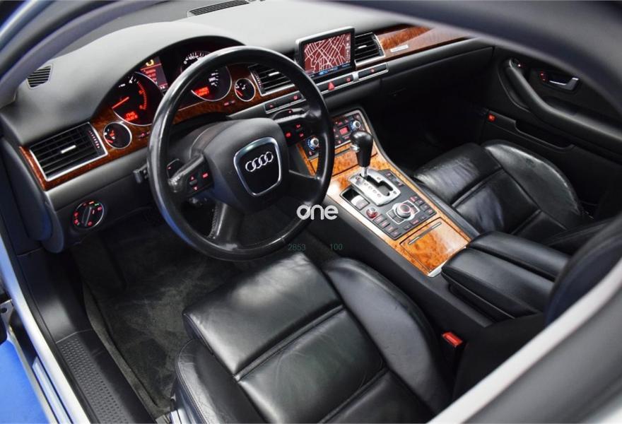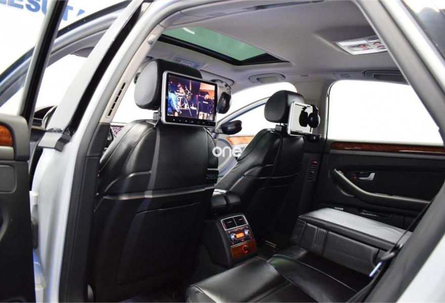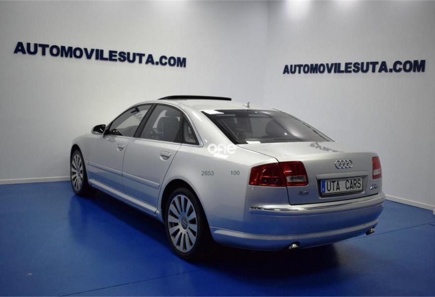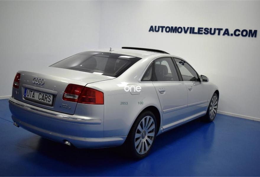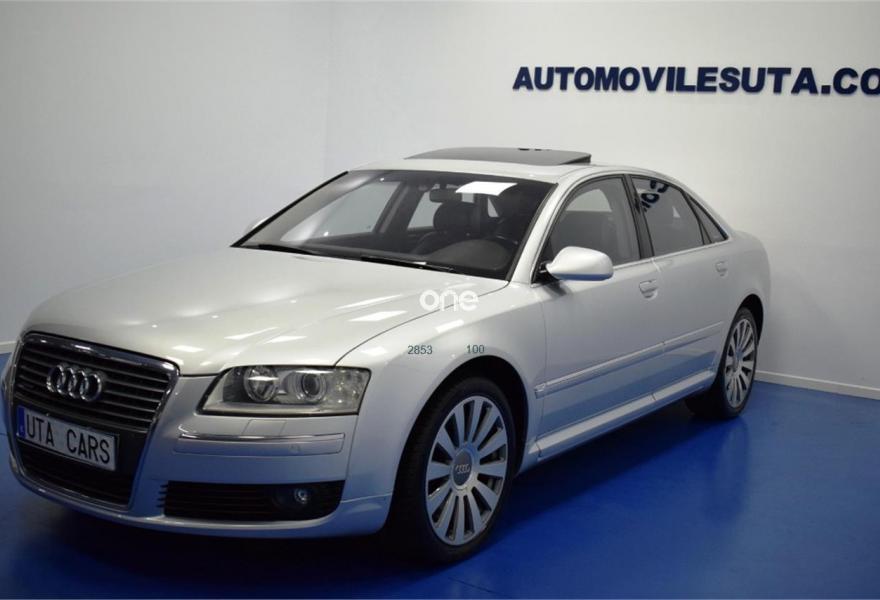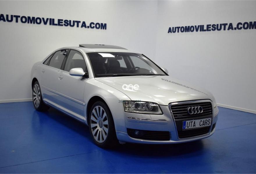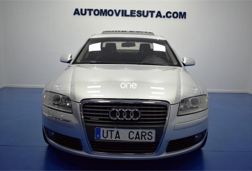 AUDI A8, Diesel, año 2007, 199000 kilómetros, color Gris / Plata , precio 15999€. TV analógica y digital+radio digital,Alfombrillas en colores especiales,Asientos calefactados delant y traser,Cuero Valcona Negro,Tapicería en cuero natural,Audi Music interface + Cargador de CD's,Equipo audiovisual RSE asientos traseros,Mando a distancia universal "home link",Preinstalación tel móv kit m.libres,Prep para GSM en apoyabrazos trasero,Receptor TV analógica y digital,Sist de sonido BOSE surround,Teléfono Audi Bluetooth GSM auricular,"Advanced key",Apertura y cierre maletero asistidos,Aro del volante en cuero special,Asientos confort con memoria,Cortinilla luna trasera eléctrica,Luz adaptativa,Paquete maletero,Sistema de control por voz,Techo corredizo de cristal,Ll aleac 8.5Jx19 "12 radios" monocolor,Pintura especial,Pintura metalizada,Suspensión neumática adaptativa Sport,ISOFIX+desactivación airbag acompañante,Sist aparcamiento acústico plus del+tras. 1 año de Garantía