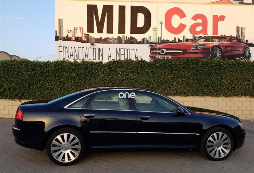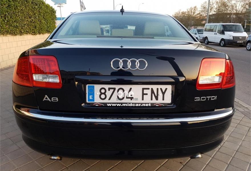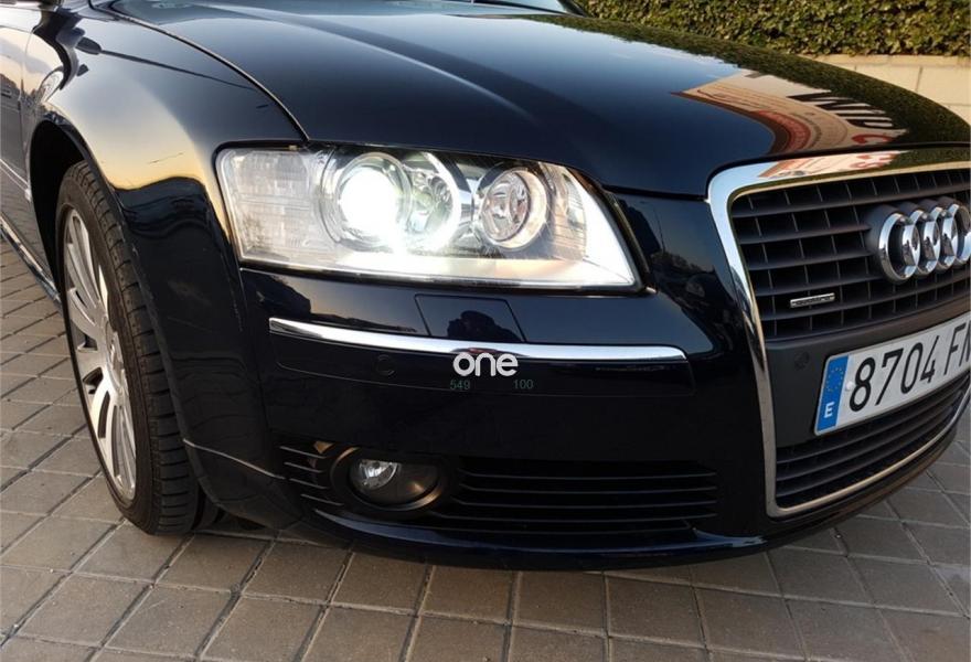 AUDI A8, Diesel, año 2007, 110000 kilómetros, color Azul (Azul Noche) metalizado, precio 17750€. Audi A8 3.0Tdi 232Cv DPF Triptronic Quattro V6, 110000Km, Libro de revisiones al día, Faros Bi-Xenón Plus con luz adaptativa, Asientos Cuero deportivos eléctricos confort, Navegador GPS MMI, Control de velocidad, Dirección asistida variable Servotronic, Acceso y arranque sin llave, Levas del cambio en el volante, Espejos retrovisores ext. antideslumbrantes aut. y plegables eléctricamente, Almohada para asientos delanteros, Sensores de luz, lluvia, Climatizador bi-zona, Volante deportivo en cuero con mandos, Suspensión neumática adaptativa, Audi Parking APS del/tras, Luz marcha diurna, Climatizador de confort de cuatro zonas,Indicador de neumático deshinchado, Paquete maletero, Portón eléctrico, Paquete portaobjetos, 4 elevalunas eléctricas, teléfono con SIM, Llantas, vehículo nacional.