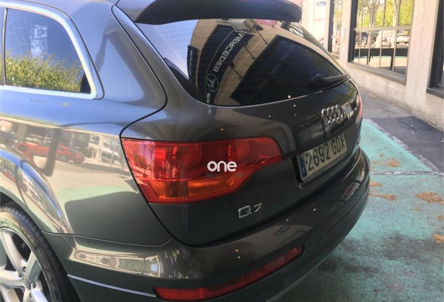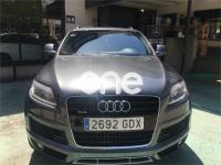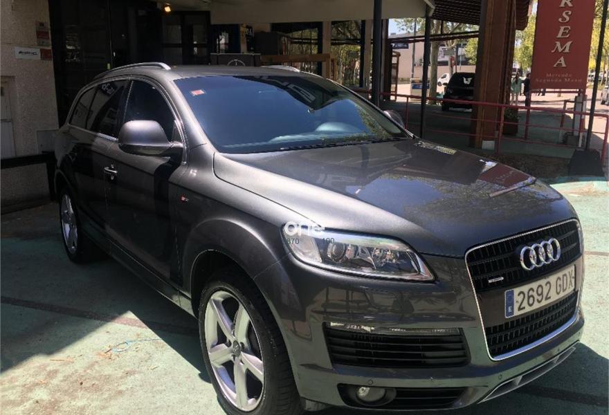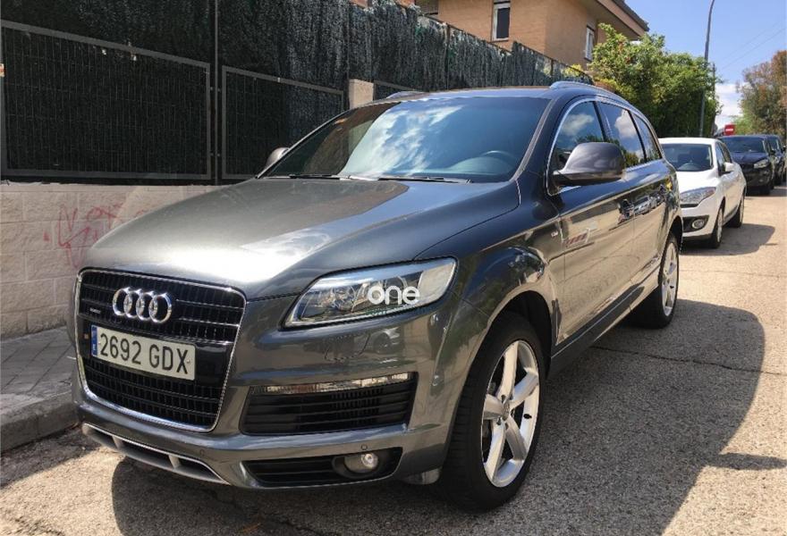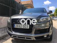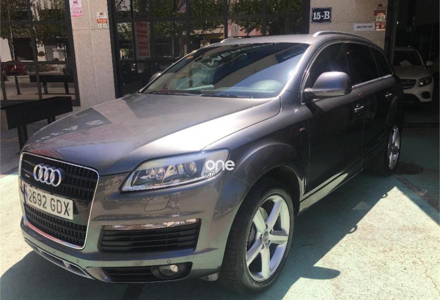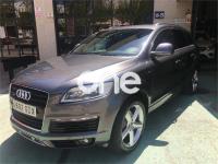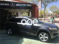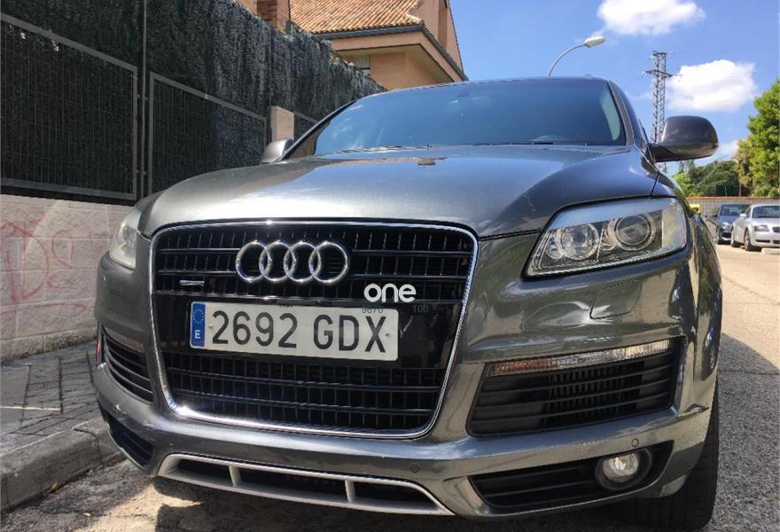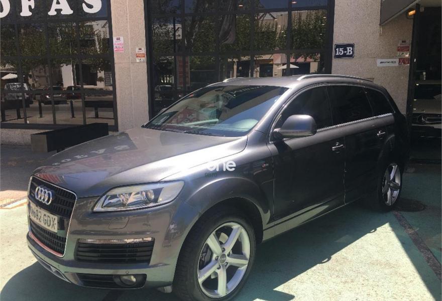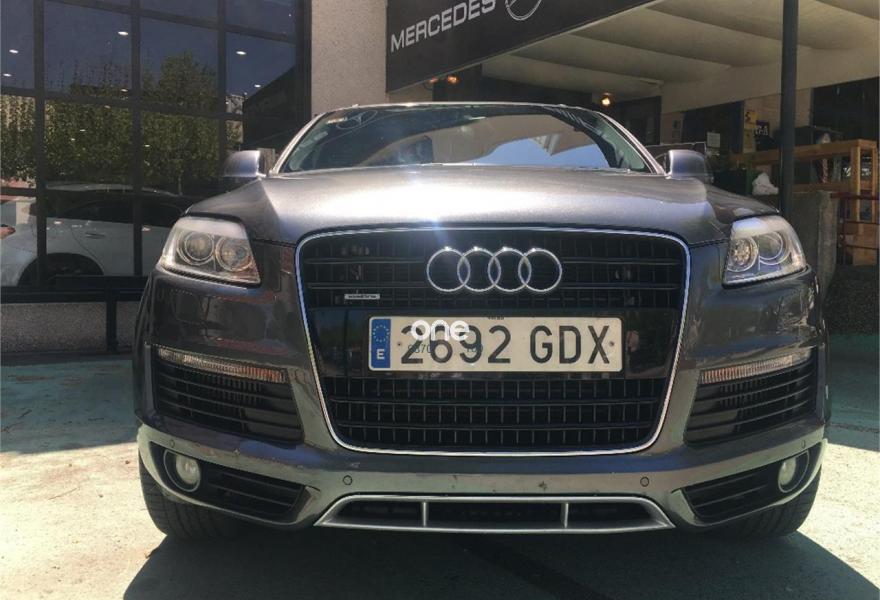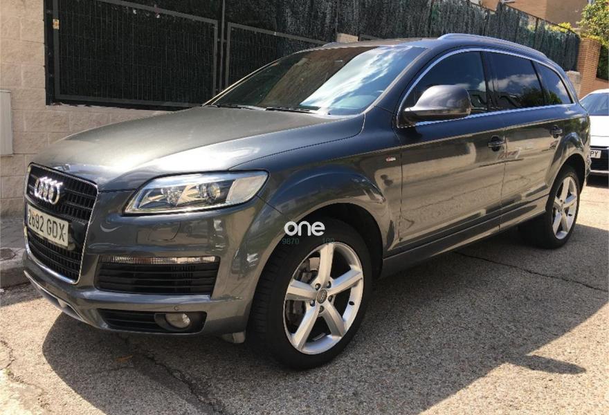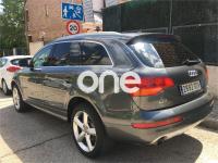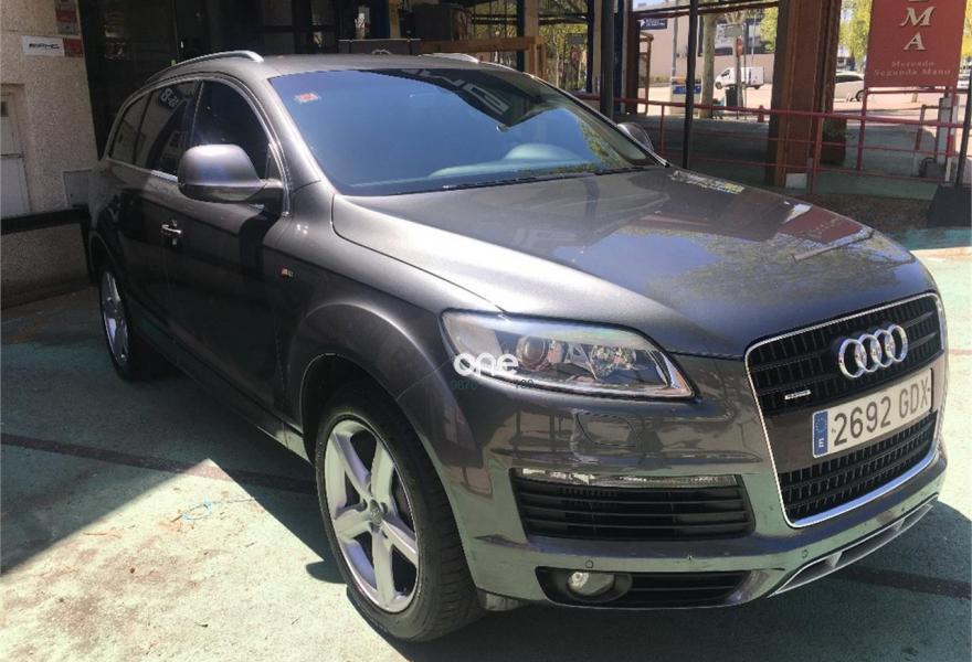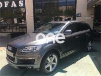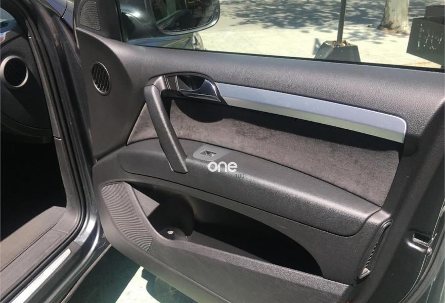 AUDI Q7, Diesel, año 2008, 267000 kilómetros, color Gris / Plata (GRIS TITANIO) metalizado, precio 15900€. Cristales laminado doble+tintado oscuro,Lane assist + side assist en combinación con Paquete S line,Alcántara/Cuero Negro - S Line,Asientos delanteros regulación eléctrica,Asientos delanteros con regulación lumbar eléctrica,Inseciones en aluminio Marlin plata,Paquete deportivo S line,Paquete diseño Alcantara/cuero Audi exclusive, con asientos deportivos color negro,Paquete portaobjetos,Tapicería de Alcantara/cuero color negro S line,Audi music interface,Intercambiador de CD para MMI basic plus,Preinstalación tfno móvil con bluetooth y apoyabrazos central confort,Sistema de navegación con DVD,Climatizador de confort de 4 zonas,Control automático de velocidad,Control de crucero adaptativo,Control de presión de neumáticos,Faros inteligentes "smart beam",Paquete exterior S line,Retrovisor interior anti-deslumbramiento,Volante multifuncional deportivo de cuero perforado, con levas y logotipo S line,Cristales tintados oscuros,Espejos exteriores retrovisores antideslumbrantes automáticos y plegables eléctricamente,Gris Cuarzo (metalizado),Llantas de aleación 9Jx20 5 brazos con neumáticos 275/45 R20,Retrovisores exteriores plegables eléctricamente con memoria,Suspensión deportiva S line,Audi parking system advanced. 7 PLAZAS ABATIBLES