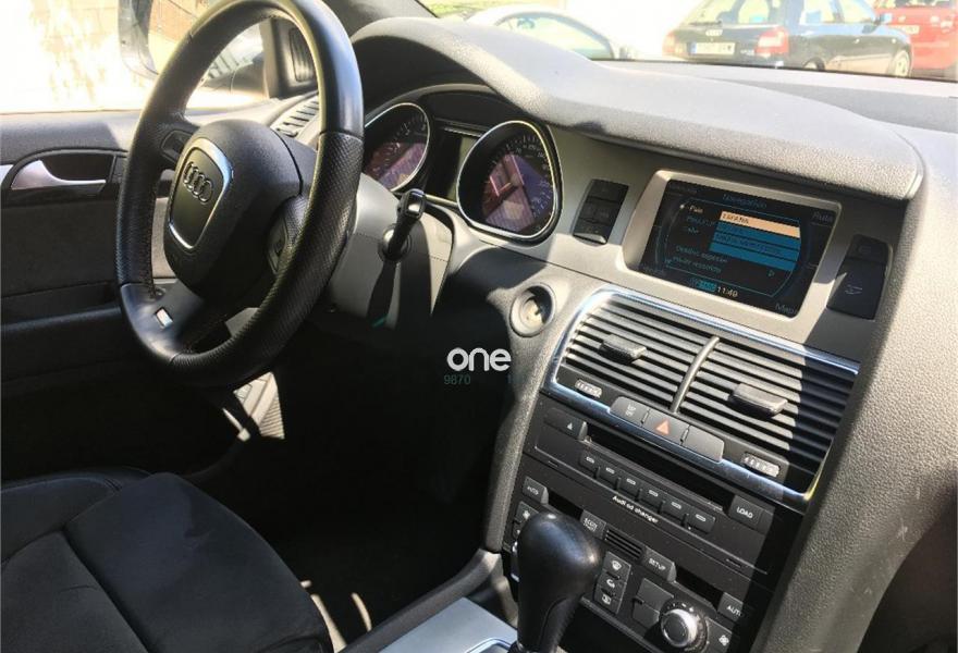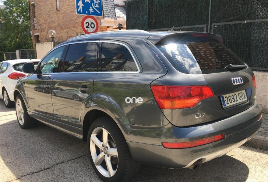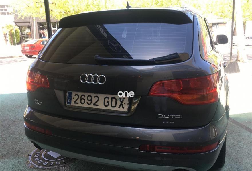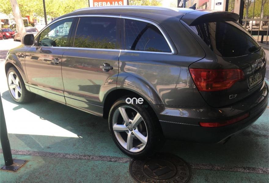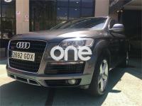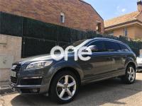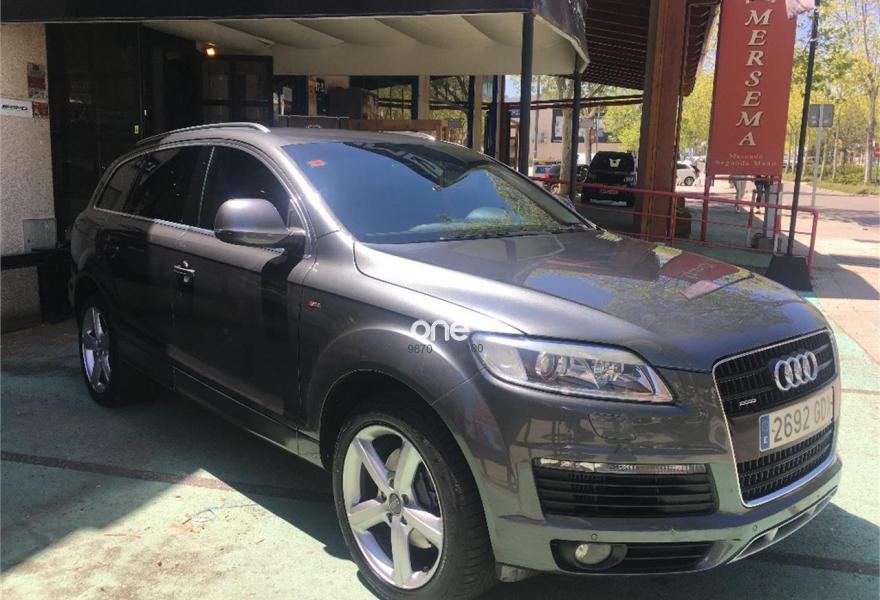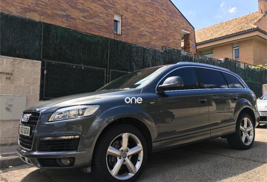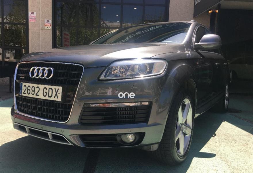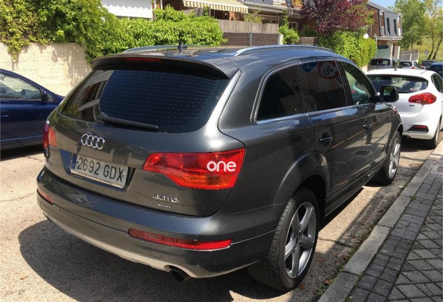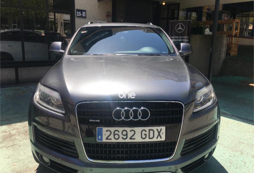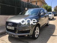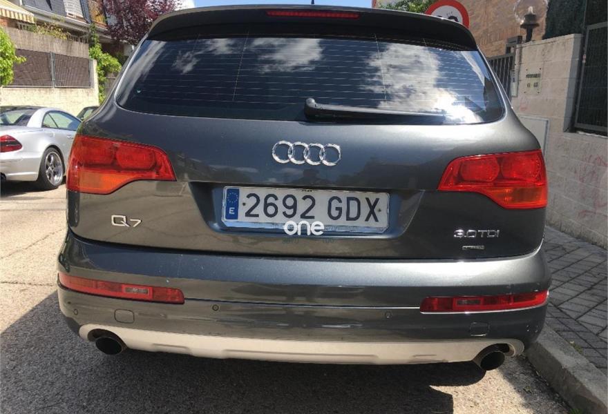 AUDI Q7, Diesel, año 2008, 267000 kilómetros, color Gris / Plata (GRIS TITANIO) metalizado, precio 15900€. Cristales laminado doble+tintado oscuro,Lane assist + side assist en combinación con Paquete S line,Alcántara/Cuero Negro - S Line,Asientos delanteros regulación eléctrica,Asientos delanteros con regulación lumbar eléctrica,Inseciones en aluminio Marlin plata,Paquete deportivo S line,Paquete diseño Alcantara/cuero Audi exclusive, con asientos deportivos color negro,Paquete portaobjetos,Tapicería de Alcantara/cuero color negro S line,Audi music interface,Intercambiador de CD para MMI basic plus,Preinstalación tfno móvil con bluetooth y apoyabrazos central confort,Sistema de navegación con DVD,Climatizador de confort de 4 zonas,Control automático de velocidad,Control de crucero adaptativo,Control de presión de neumáticos,Faros inteligentes "smart beam",Paquete exterior S line,Retrovisor interior anti-deslumbramiento,Volante multifuncional deportivo de cuero perforado, con levas y logotipo S line,Cristales tintados oscuros,Espejos exteriores retrovisores antideslumbrantes automáticos y plegables eléctricamente,Gris Cuarzo (metalizado),Llantas de aleación 9Jx20 5 brazos con neumáticos 275/45 R20,Retrovisores exteriores plegables eléctricamente con memoria,Suspensión deportiva S line,Audi parking system advanced. 7 PLAZAS ABATIBLES