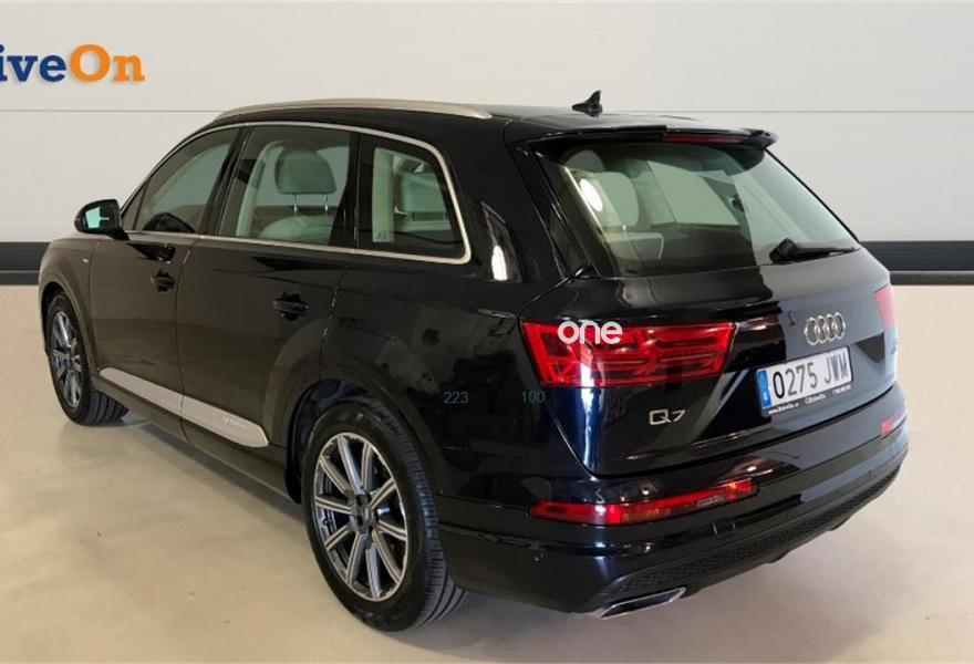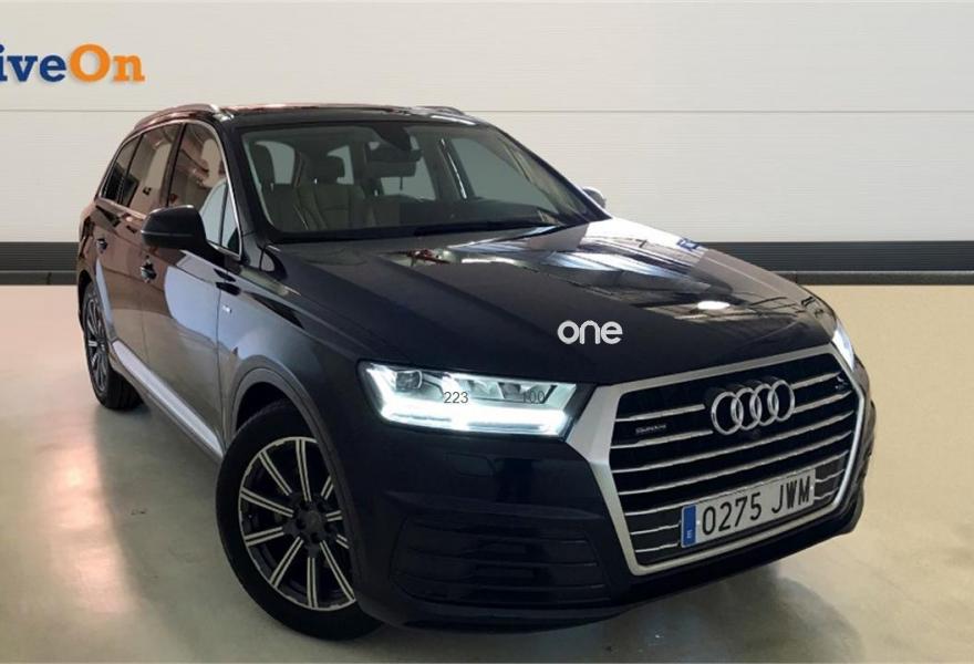 AUDI Q7, Diesel, año 2017, 44529 kilómetros, color Azul (AZUL TINTA) , precio 64900€. Sistema de aviso de límite de velocidad por reconocimiento de señales,Audi Smartphone Interface,Superior aluminio cepillado / Inferior marrón nuez,Asientos calefactados delanteros y traseros,MMI Navegación plus con MMI Touch,Paquete exterior S line,Volante deportivo de cuero multifuncional de 3 radios con levas de cambio,Capacidad del depósito de 85 l.,Azul Tinta (efecto perla),3ª fila de asientos,Head-up Display,Audi virtual cockpit,Suspensión neumática adaptativa,Set de reparación de neumáticos,Paquete de asistentes de aparcamiento. Nuestra propuesta: