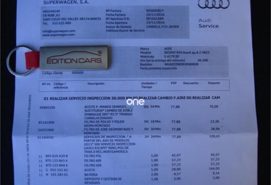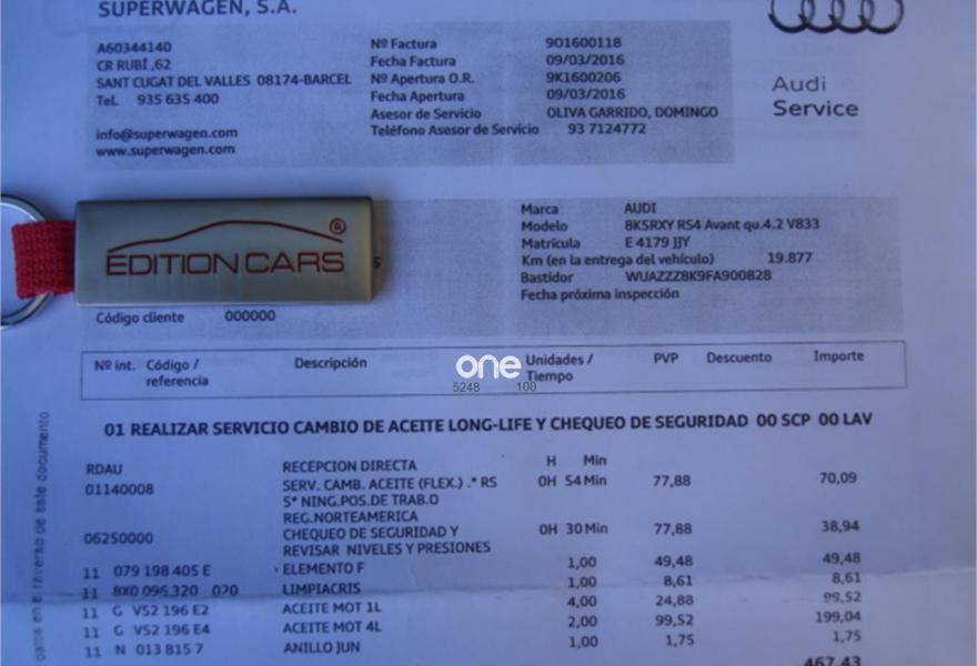 AUDI RS4, Gasolina, año 2015, 33000 kilómetros, color Azul (NOGARO) metalizado, precio 69900€. Sistema de escape deportivo,Alfombrillas en colores especiales Audi exclusive,Asientos delanteros calefactables,Asientos delanteros y traseros calefactables,Inserciones en malla de acero inoxidable,Inserciones interiores en aluminio Race,Paquete portaobjetos,Tapicería de cuero Valcona Audi exclusive (paquete 2),Cargador de CD,Cargador de CD + Reproductor de DVD,Equipo de sonido Bang & Olufsen,Instalación básica manos libres (Bluetooth) para teléfono móvil,Instalación manos libres (Bluetooth) para teléfono móvil,Mando a distancia (HomeLink),MMI navegación plus,Radio digital DAB,Cortinilla en ventanas laterales posteriores,Control Automático de Velocidad (Tempomat),Audi side assist (asistente de cambio de carril),Cuero Napa Fina Negro - Techo Negro - Asientos Deportivos S,Diferencial trasero deportivo,Diseño carbono para tapa del motor,Espejo retrovisor interior antideslumbrante,Espejos retrovisores exteriores calefactables antideslumbrantes automáticamente y abatibles eléctricamente,Faros inteligentes "smart beam",Llave de confort "advanced key",Luz adaptativa "dynamic adactative light",Paquete cuero,Pinzas de freno pintadas en negro brillante con inscripción RS en pinzas delanteras,Portón del maletero de accionamiento automático,Techo panorámico de cristal,Toma de corriente de 230 Voltios,Colores personalizados Audi exclusive,Llantas de aleación 9Jx20 diseño de 5 brazos rotor con neumáticos 265/30 R 20,Pintura metalizada,Pintura personalizada Audi exclusive,Frenos delanteros cerámicos,Volante deportivo de cuero multifuncional con levas, diseño RS. SERIE LIMITADA NOGARO SELECTION CONMEMORACION 20 ANIVERSARIO AUDI RS2. MAX FULL EQUIP CON TODOS LOS EXTRAS POSIBLES, A DESTACAR: SISTEMA DE SONIDO BANG & OLUFSEN, AUDI MMI MULTIMEDIA CON DVD, JUKEBOX, MEMORY CARDS SD, AUDI CONNECT WLAN WIFI,BLUETOOTH, FRENOS CERAMICOS, PAQUETE DYNAMIC, SISTEMA TEMPOMAT CON RADAR, TECHO PANORAMICO, ASISTENTES CONDUCCION, MANTENIMIENTO DE CARRIL, LLANTA 20', EQUIPAMIENTO AUDI EXCLUSIVE, APERTURA MEDIANTE LLAVE INTELIGENTE, HOMELINK, CARBONO EXCLUSIVO CON INSERCIONES AZULES, COSTURAS EXCLUSIVAS AZULES, PORTON TRASERO ELECTRICO, TECHO PANORAMICO, ASIENTOS ELECTRICOS CON MEMORIA, ASIENTOS CALEFACTABLES DELANTEROS Y TRASEROS, SENSORES PRESION NEUMATICOS, RECONOCIMIENTO DE VOZ, CRISTALES TINTADOS, ETC, ETC. 5 AÑOS GARANTIA OFICIAL AUDI HASTA 10/ 2019. REVISIONES SIEMPRE EN CONCESIONARIO OFICIAL AUDI.PRECIO NUEVO 130.000 EUROS, EN EL FUTURO SERA PIEZA DE COLECCIONISTA Y AUMENTARA SU VALOR PUES ES UNA SERIE LIMITADA PARA CELEBRAR EL 20 ANIVERSARIO DEL AUDI RS2.