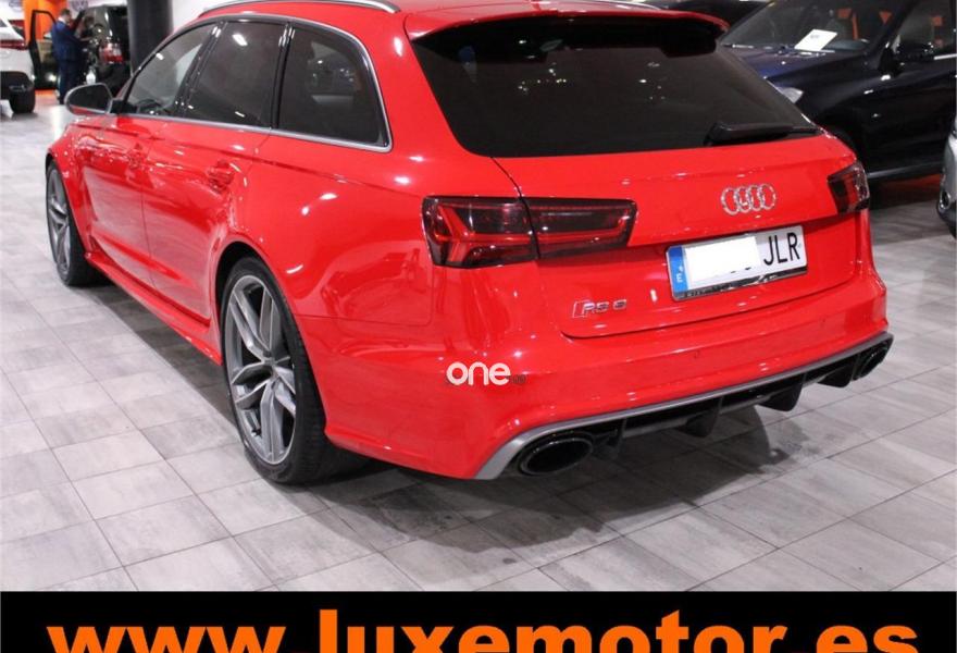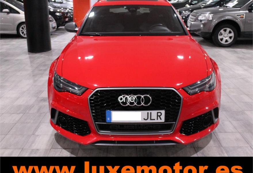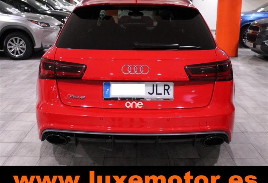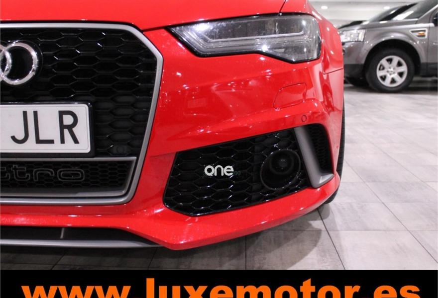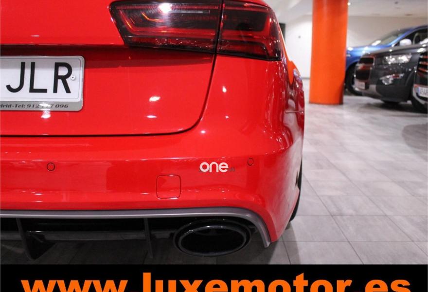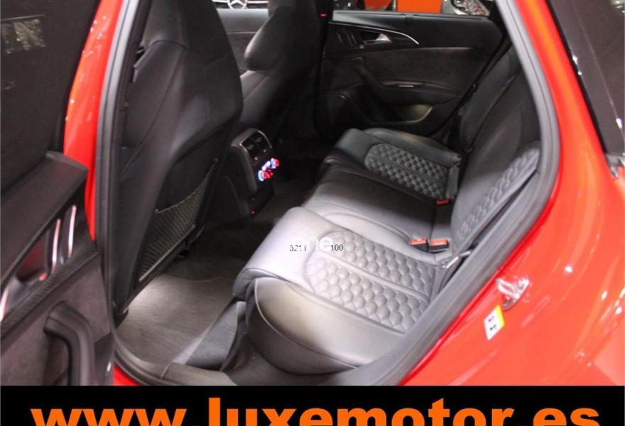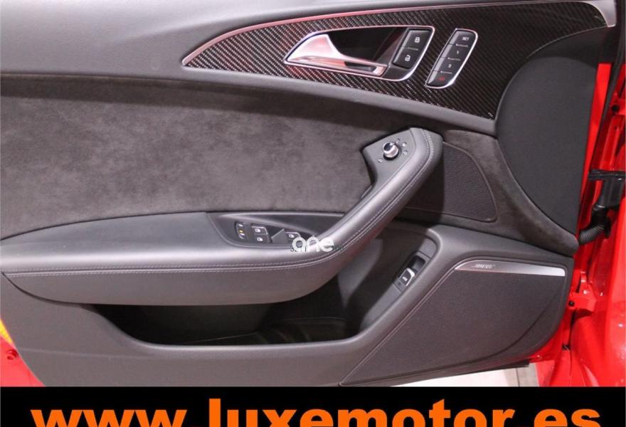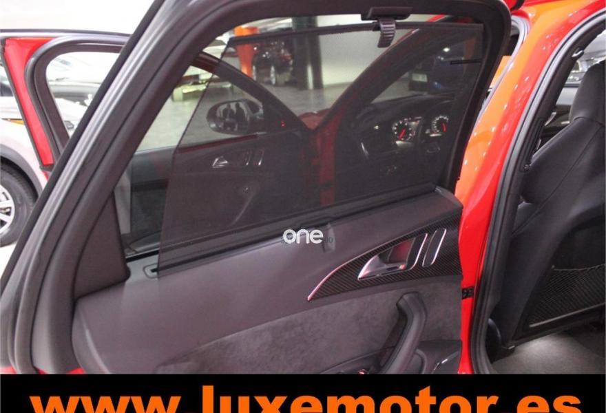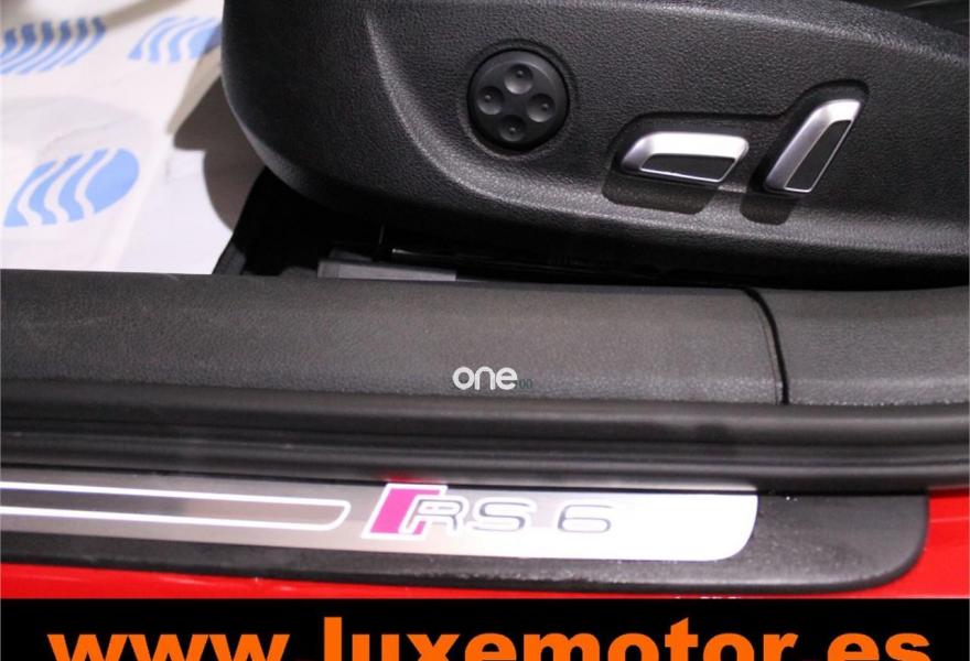 AUDI RS6, Gasolina, año 2015, 36817 kilómetros, color Rojo , precio 99990€. Asistente de aparcamiento park assist,Audi side assist con Audi pre sense rear y Audi active lane assist,Paquete de asistentes incluido Audi pre sense plus,Sistema de aviso de límite de velocidad por reconocimiento de señales,Alfombrillas con inscripción RS 6 Audi exclusive,Alfombrillas en colores especiales Audi exclusive,Asientos calefactados delanteros,Inserciones en lacado brillante negro,Moqueta y alfombrillas en colores especiales Audi exclusive,Paquete de cuero Valcona Exclusive (paquete 1),Paquete en piel Valcona (Paquete 1) con costuras en panel de abeja de Audi Exclusive,Revestimiento interior del techo en Alcantara de color negro,Tapicería en cuero Valcona RS,Audi phone box con Audi connect,Radio Digital DAB,Sistema de sonido BOSE Surround,Asistente de luces largas,Cable USB,Cierre servoasistido de las puertas,Cuero Valcona RS Negro - Techo Negro - Asientos RS,Dirección dinámica,Faros Audi Matrix LED,Interface para sistema de localización de vehículos (preinstalación),Techo panorámico eléctrico,Volante y pomo en cuero Audi exclusive,Cristales tintados oscuros,Llantas de aleación 9,5 J x 21 diseño de 5 radios en óptica de titanio mate con neumáticos 285/30 R21,Pintura personalizada Audi exclusive,Rojo Misano (efecto perla),Sistema de escape RS,Frenos cerámicos,Paquete dynamic plus,Tren de rodaje deportivo plus RS con DRC,Volante deportivo de cuero multifuncional de 3 radios con levas de cambio, calefactable,Audi active lane assist,Asistente de visión nocturna - Night vision,Control de crucero adaptativo incluye Audi pre sense front,Cuatro cámaras de entorno. LUXEMOTOR