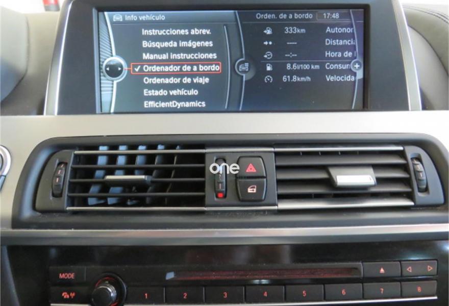 BMW Serie 6, Diesel, año 2013, 111000 kilómetros, color Negro (OPORTUNIDAD - 100% FINANCIACIÓN) metalizado, precio 35990€. Asientos de confort delanteros, con reglaje eléctrico,Calefacción de los asientos delanteros,Sistema de navegación Professional,Sistema HiFi Professional,Advertencia de cambio de carril,Asistente de luz de carretera,BMW Live,Control de crucero activo con función Stop&Go,Cuero 'Dakota' Elfenbeinweis,Luces autoadaptables,Persiana solar en la luneta trasera,Techo de cristal, eléctrico,Black Sapphire (metalizado),Pintura metalizada,20'', llantas de aleación ligera de radios en V (estilo 356) con neumáticos de diferentes dimensiones y con funcionamiento en caso de avería,BMW Head-Up Display,Asistente de aparcamiento,Cámara para marcha atrás. * IMPORTE DE CUOTAS FINANCIANDO LA TOTALIDAD AL MÁXIMO PLAZO: 522 EUROS AL MES
