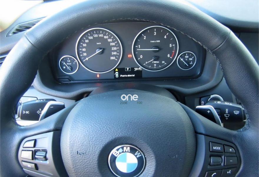BMW X3, Diesel, año 2013, 90000 kilómetros, color Negro metalizado, precio 20500€. Paquete Business (sólo para empresas/flotas y autónomos),Calefacción de los asientos delanteros,Cuero 'Nevada',Molduras interiores Aluminium con rectificado longitudinal fino,Dispositivo manos libres con interfaz USB,Sistema de altavoces HiFi,Sistema de navegación Business,Cambio automático,Cuero 'Nevada' Beige,Espejos retrovisores interior y exteriores con ajuste automático anti-deslumbramiento,Faros bi-xenón,Lavado de faros,Retrovisor interior con ajuste automático anti-deslumbramiento,Sensor de lluvia,Volante M de cuero,17" Llantas de aleación ligera Streamline 306,Carriles longitudinales para la baca BMW Individual Shadow Line de brillo intenso,Pintura metalizada,Volante deportivo multifunción de cuero con levas de cambio,Control de distancia en aparcamiento (PDC) delante y detrás. *Procedente directamente de Concesión Oficial BMW España.