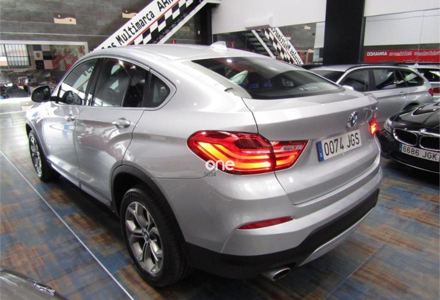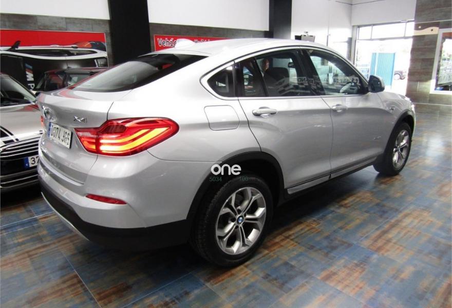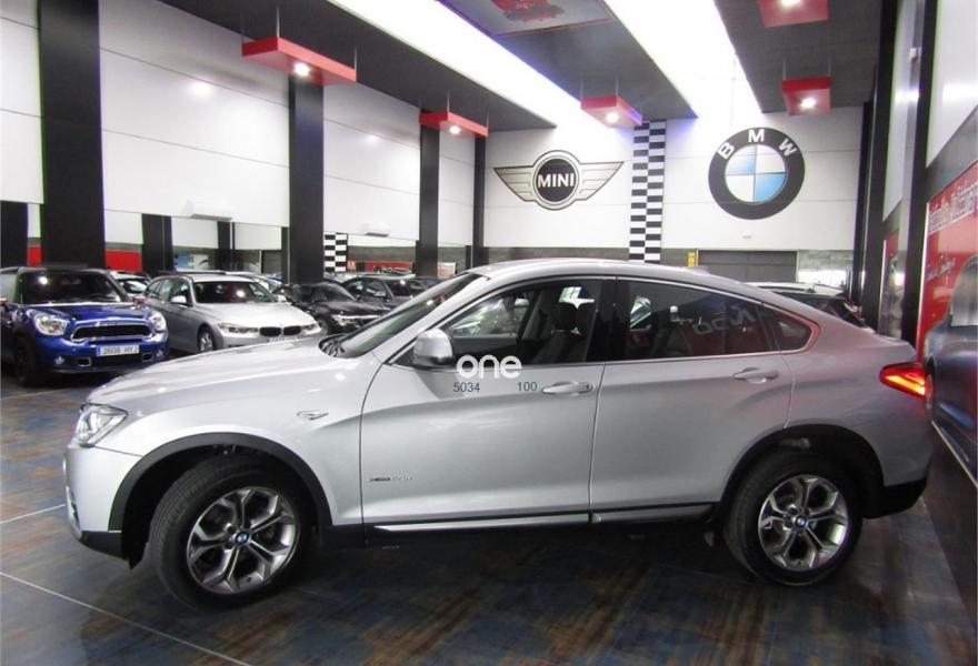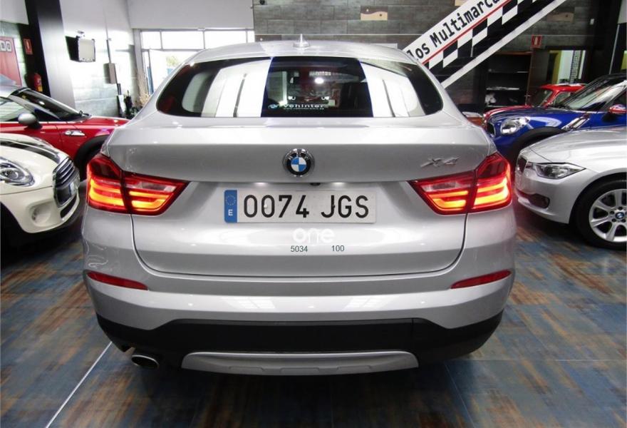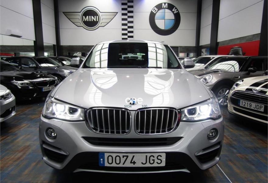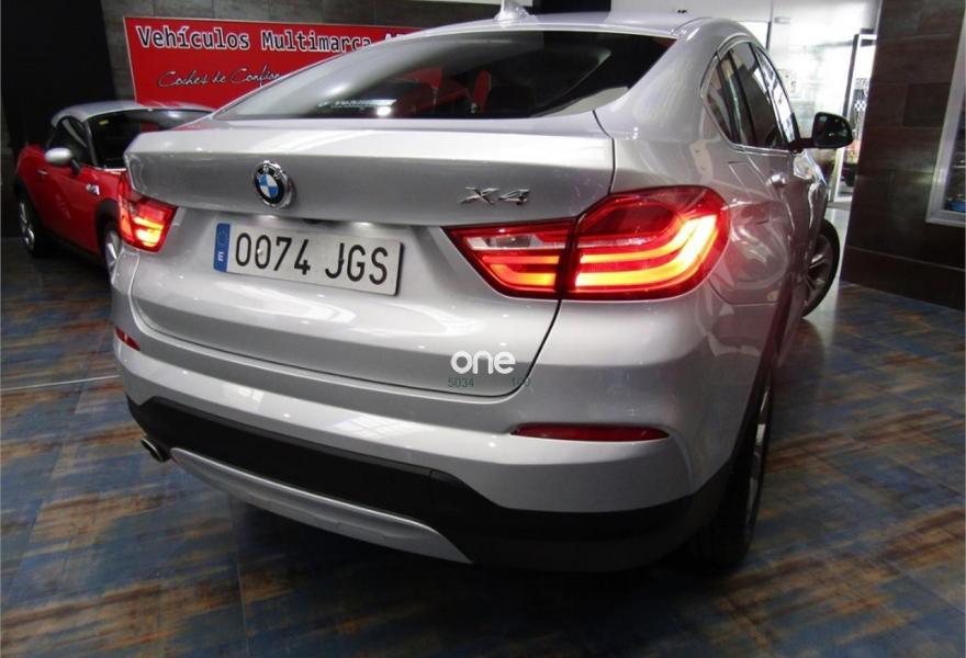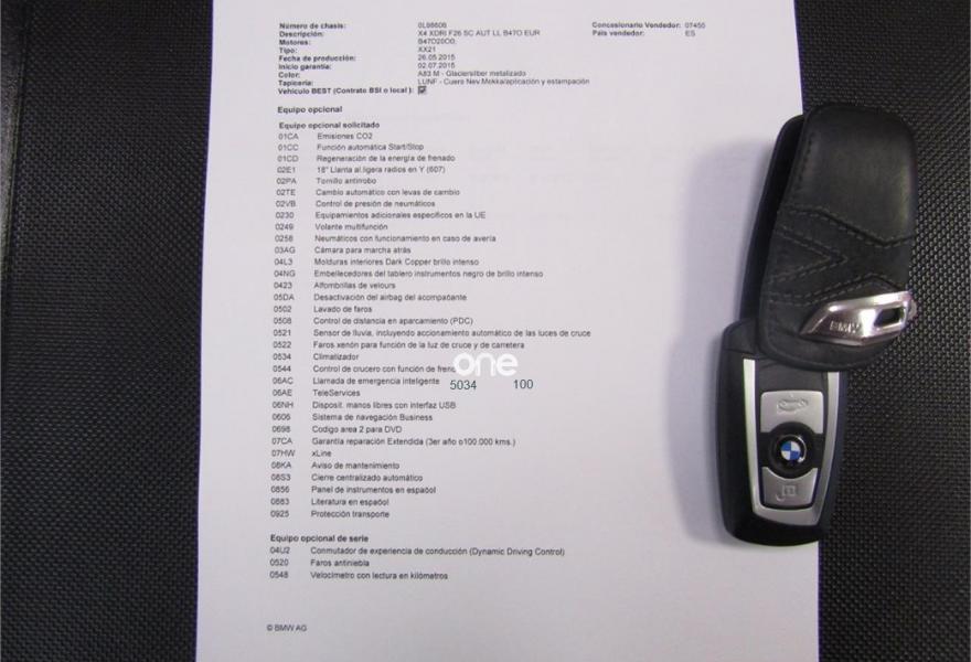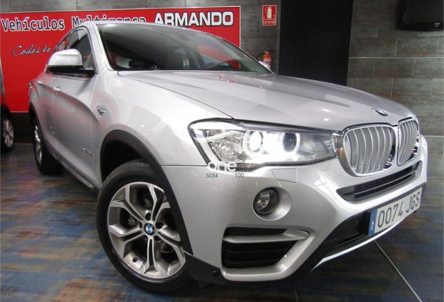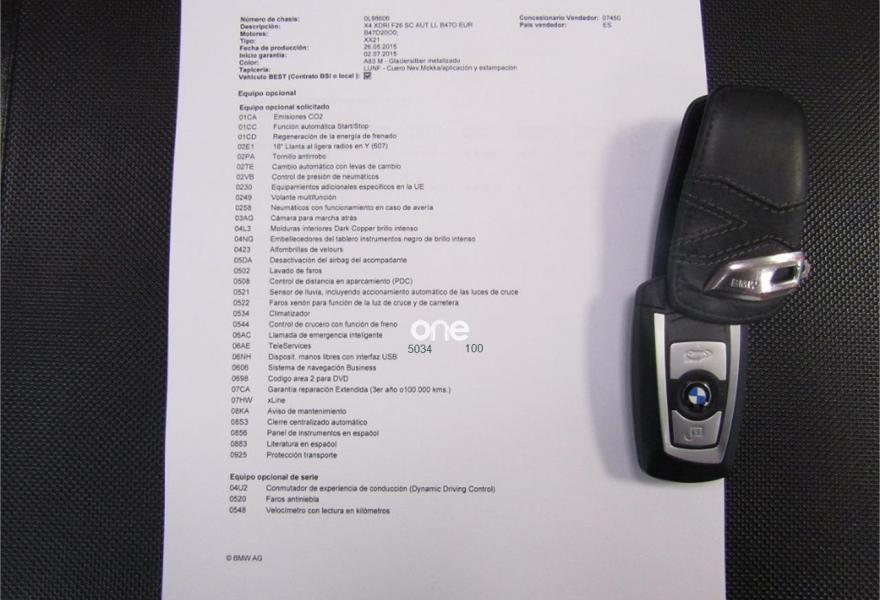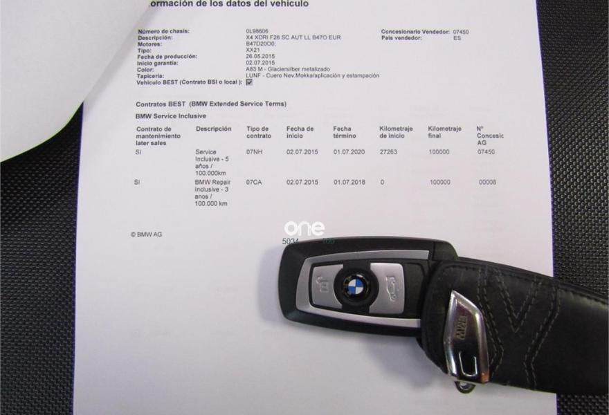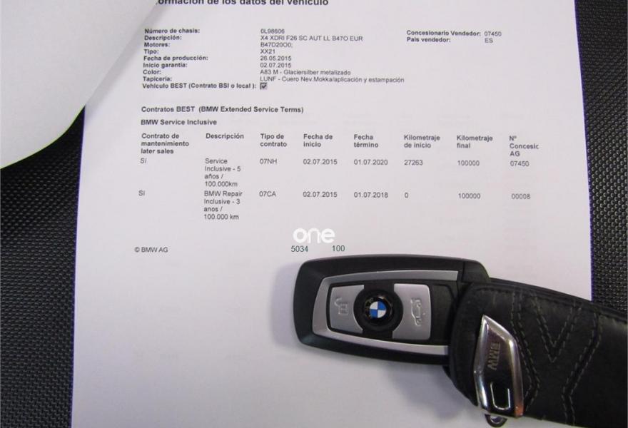 BMW X4, Diesel, año 2015, 61000 kilómetros, color Gris / Plata metalizado, precio 35900€. xLine,Cuero 'Nevada' Schwarz/aplicación y repujado Schwarz,Sistema de navegación Business,Caja de cambios Steptronic con levas de cambio,Faros xenón,Franja gris en el parabrisas,Lavado de faros,Luces autoadaptables,Telefonía de confort con conexión ampliada para smartphone,Servicios ConnectedDrive,Retrovisor interior, con ajuste automático anti-deslumbramiento,Pintura metalizada,18" Llantas de aleación ligera de radios en V (estilo 307),Cámara para marcha atrás. VEHICULO EN PERFECTO ESTADO++JULIO DEL 2015++NACIONAL+CON HISTORIAL COMPLETO EN BMW Y MANTENIMIENTO INCLUIDO EN EL PRECIO HASTA JULIO DEL 2020 O 100000KM EN CUALQUIER BMW DE ESPAÑA SIN NINGUN COSTE ACEITES Y FILTROS+++++