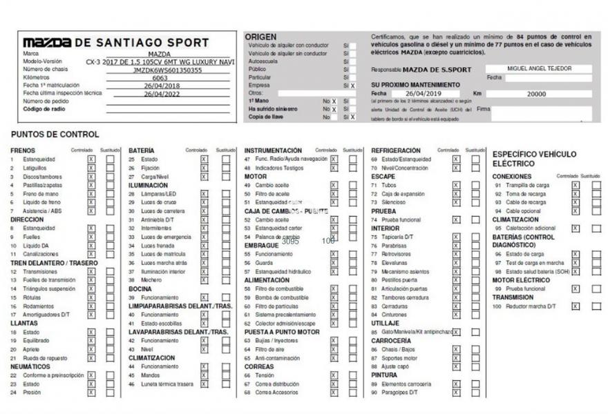 Su equipamiento cuenta con faros FULL LED, sensor de aparcamiento trasero con cámara, sistemas de asistencia a la frenada en ciudad con reconocimiento de peatones y de cambio de carril involuntario, Head Up Display, navegador, sistema MZD Connect con pantalla táctil de 7", sistema de audio premium BOSE, sensor de humedad, climatizador, elevalunas eléctricos, sensor de lluvia y luces, packs LUXURY y STYLE, etc.