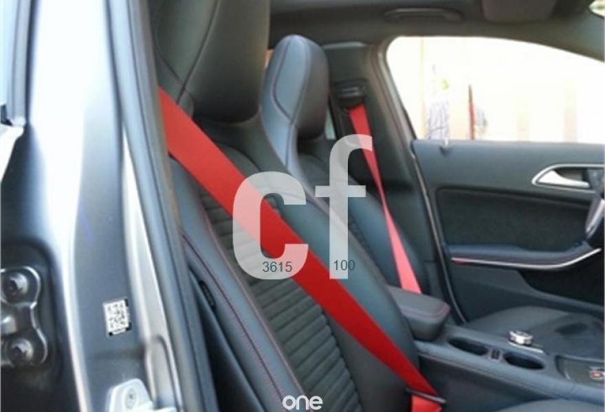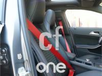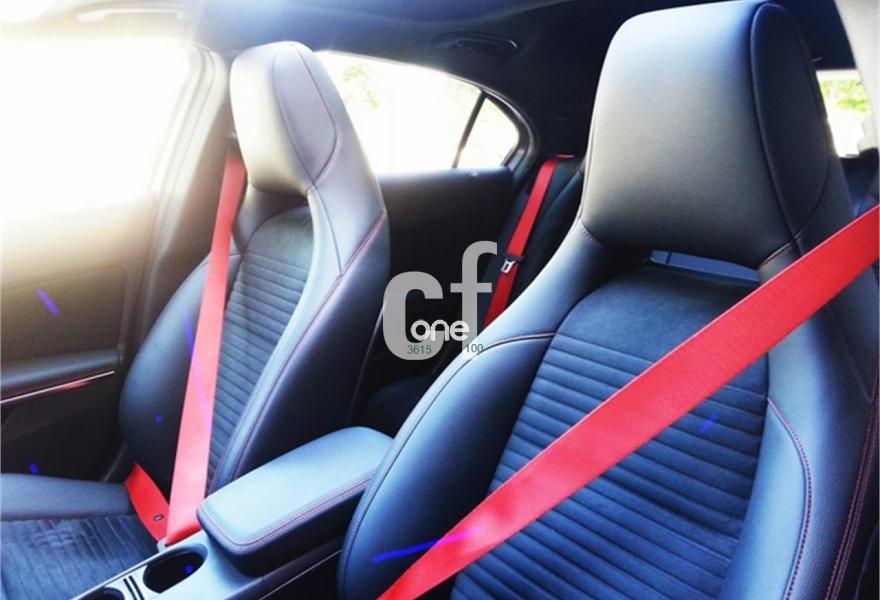 Asientos deportivos con cosido rojo y cinturones rojos