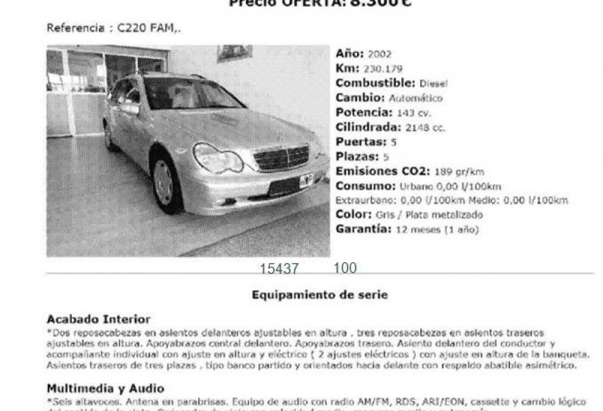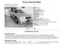 MERCEDES-BENZ Clase C, Diesel, año 2002, 230179 kilómetros, color Gris / Plata metalizado, precio 8300€. Calefacción eléct.asientos delanteros,Piezas de madera designo "Cinnamora",Respaldo as.cond.contorno variable,Saco para esquíes,Volante en cuero y madera-designo,Techo corr.elevador eléctr.de cristal,Retrovs.izd.e int.antideslumbr.autom.,4 neumáticos de invierno,Pintura metalizada,Camb.auto.5v por pulsador C220 CDI T,Anclajes para asiento Isofix. MERCEDES C220 AVANTGARDE FAMILIAR 143CV . FECHA MATRICULACIÓN 10-2002. REVISIONES EN SERVICIO OFICIAL MERCEDES, IMPORTADO, IMPECABLE ESTADO. RECIÉN PINTADO, REVISION COMPLETA RECIÉN HECHA,ACEITE, FILTROS, ACEITE CAMBIO CON FILTRO, ETC .precio con transferencia e impuestos incluidos. PRECIO CON GARANTÍA DE 12 MESES TOTAL SE LE SUMARAN 500€ (8800€).
