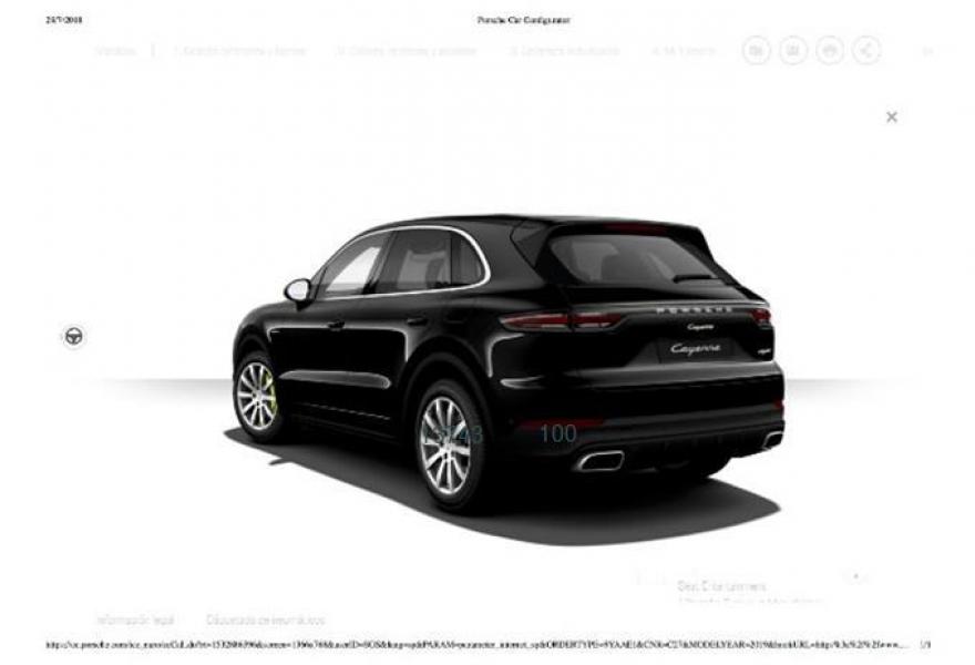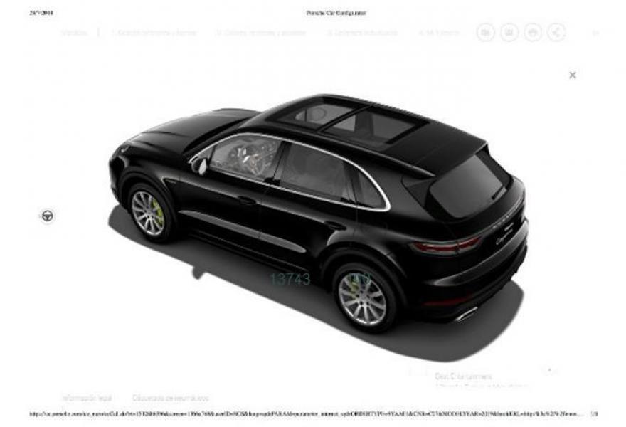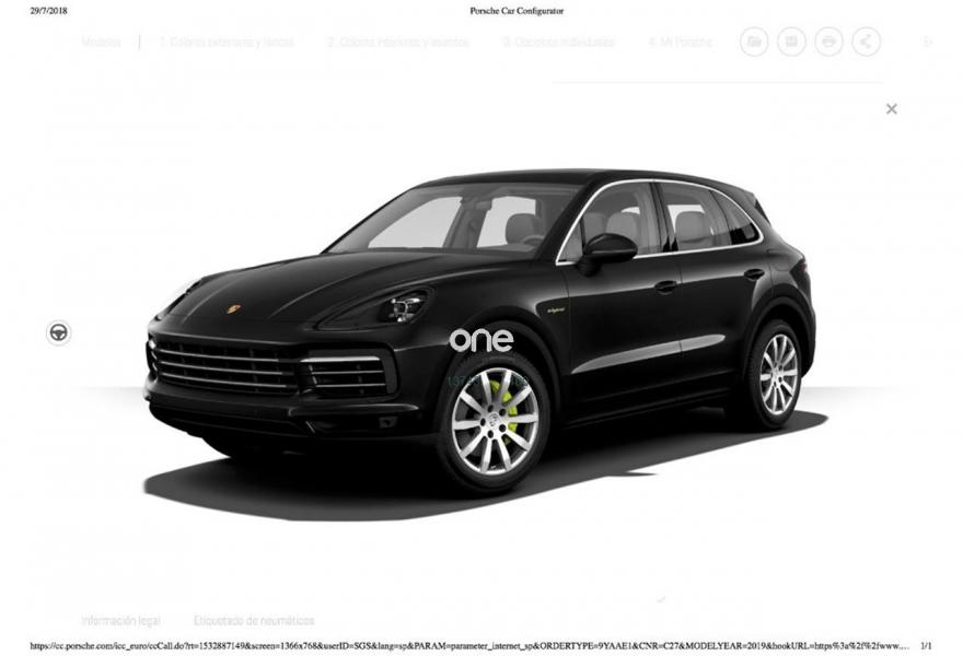 PORSCHE Cayenne, Eléctrico / Híbrido, año 2018, 5500 kilómetros, color Negro metalizado, precio 101500€. Indicador de límites de velocidad,Alfombrillas,Asientos delanteros calefactables,Paquete fumadorr,Acceso Comfort,Faros principales LED en color negro incl. PDLS,Interior en cuero Negro,Paquete memoria conductor,Sistema de techo panorámico,Depósito de combustible de 90 litros,Colores metalizados,Llantas de 19" Cayenne S,Suspensión neumática y sistema de suspensión activa Porsche Active Suspension Management (PASM),Cámara de marcha atrás,Negro Jet (metalizado),Cristales tintados,Soporte para Smartphone. Vehículo matriculado actualmente a nombre de la fábrica "PORSCHE STUTTGART AG" con fecha 18.07.2018 por un período mínimo de tres meses, adquirido mediante contrato privado de cv por la mercantil "URBEX MEDITERRANEAN, S.L.U." y disponible para entregarlo a partir del 18 de Octubre de 2018 con un kilometraje máximo de 5.500 kms.