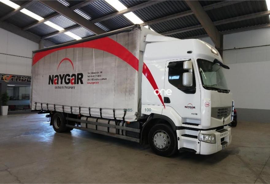 RENAULT PREMIUM DXI 460.18, año 2010, 843000 kilómetros, precio 15500€. Renault Premium de 18000 kilos de PMA, con una tara de 9850 kilos, motor de 6 cilindros EURO5, ruedas 315/60 R22, 5 y lleva una carrocería tauliner de: 7, 27m x 2, 47m x 2, 90m (medidas interiores). Equipado con un enganche remolque marca Rockinger,