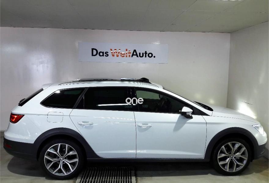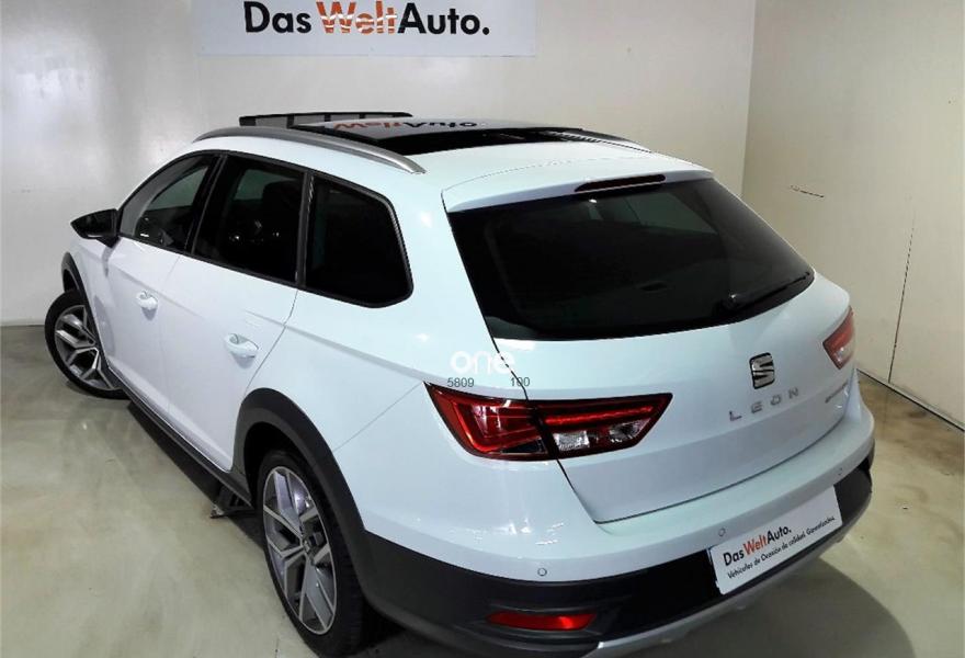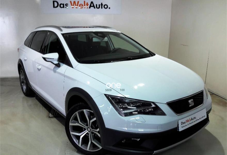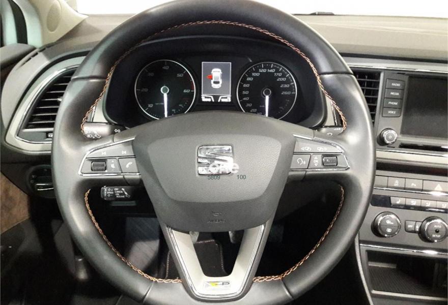 SEAT Leon, Diesel, año 2015, 19850 kilómetros, color Blanco metalizado, precio 17900€. Pack Alcantara,Paquete Invierno: Asientos delanteros calefactables, lavafaros con eyectores calefactables y retrovisores calefactables,Sistema de Navegación,Alarma volumétrica,Convenience Pack: Sensor de luz (con función Coming and Leaving Home) + Sensor de lluvia + Espejo interior electrocromático,Cortinillas traseras,SEAT Full LED + luces diurnas LED + LED traseros (sin función cornering) - En Reference sólo disponible para Flotas,Techo eléctrico,Barras en techo cromadas,Blanco Nevada (metalizado),Llanta Aleación 18" X-PERIENCE Machined,Retrovisores exteriores plegables eléctricamente y calefactables,Driving Assistance Pack: Asistentes de luces de carretera cortas/largas + Asistente de salida involuntaria de carril,Cámara de visión trasera,Style Safety Pack: Recordatorio de abrochado de cinturones, Detector de fatiga, Airbag lateral posterior, Front Assist y Sensor deaparcamiento delantero y trasero.,Cristales traseros oscuros. *PVP SUJETO A FINANCIAR UN CAPITAL MINIMO DE 12.000€ Y MINIMO 60 MESES Y ENTREGA DE COCHE DE MÁS DE 10 AÑOS.VALIDO HASTA 31-08-2018.